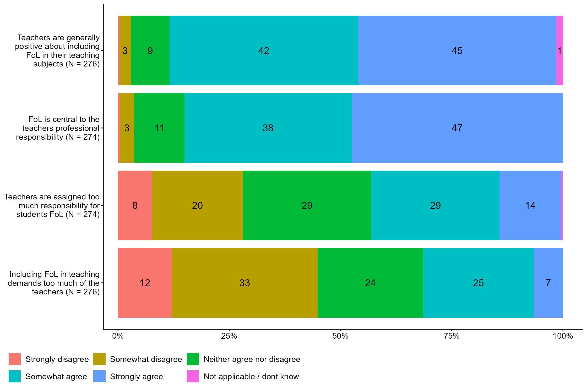 Figur 2.3.How do you view teachers’ work with public health and life skills (FoL) at your school? By teachers we mean, for example, subject teachers, homeroom/contact teachers and special education teachers; the position may be full-time, part-time or temporary.. N = [274–276], Figurdata (XLSX), PNG. (SLQ8_1,SLQ8_2,SLQ8_3,SLQ8_4)