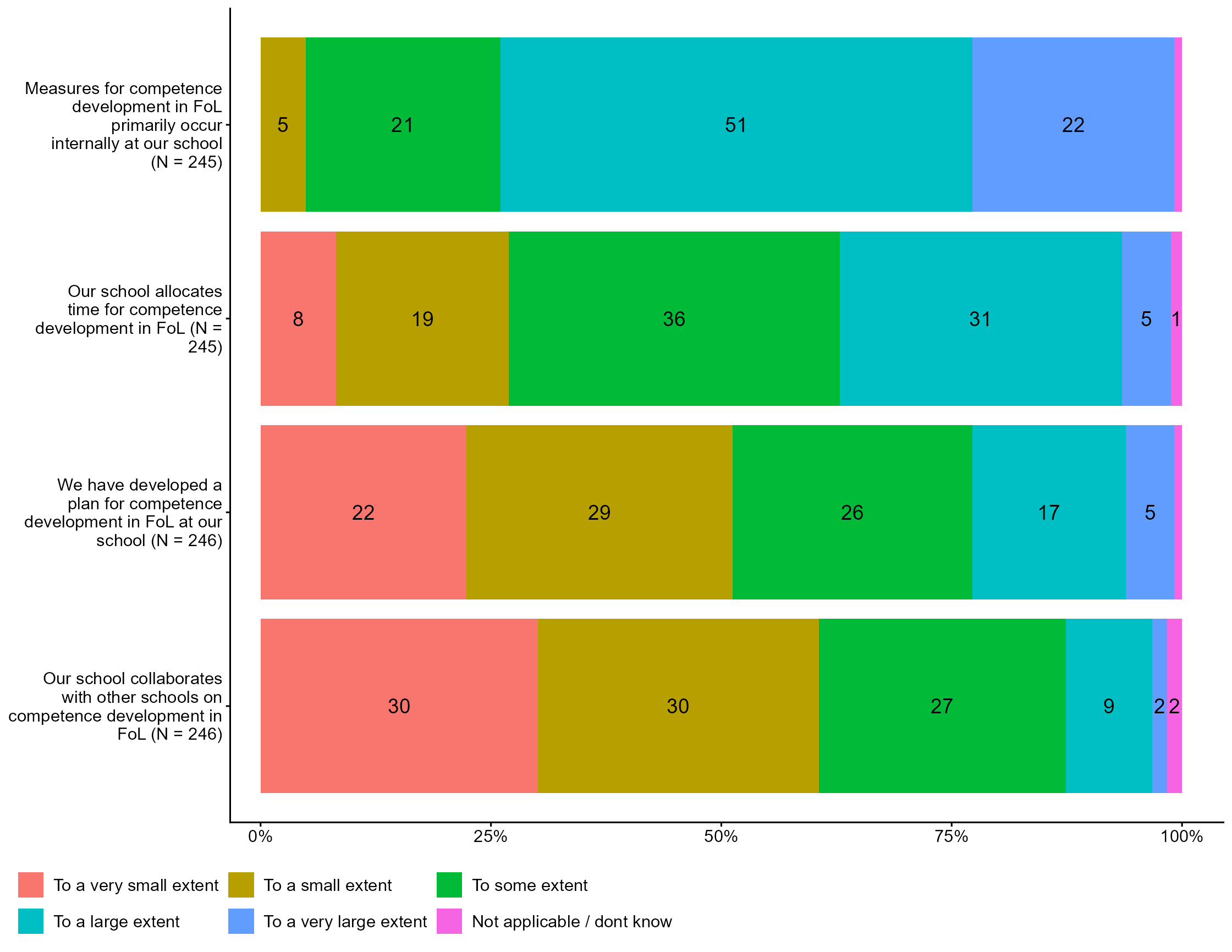Figur 2.11.To what extent do you agree with the following statements about competence development within public health and life skills (FoL)?. N = [245–246], Figurdata (XLSX), PNG. (SLQ21_1,SLQ21_2,SLQ21_3,SLQ21_4)