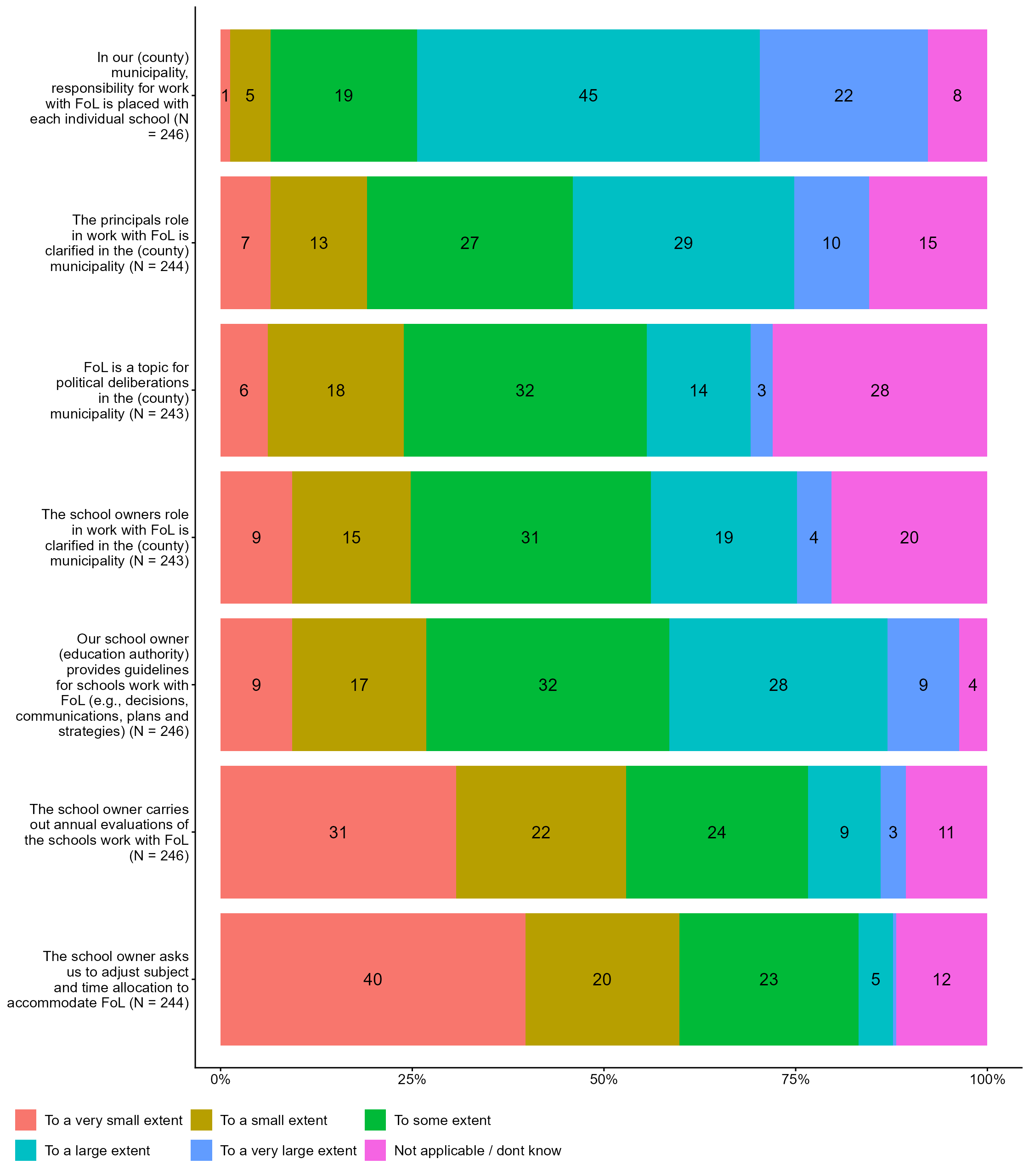 Figur 2.10.Below are some statements about work with public health and life skills (FoL) carried out by the school owner. To what extent do they fit your (county) municipality?. N = [243–246], Figurdata (XLSX), PNG. (SLQ20_1,SLQ20_2,SLQ20_3,SLQ20_4,SLQ20_5,SLQ20_6,SLQ20_7)