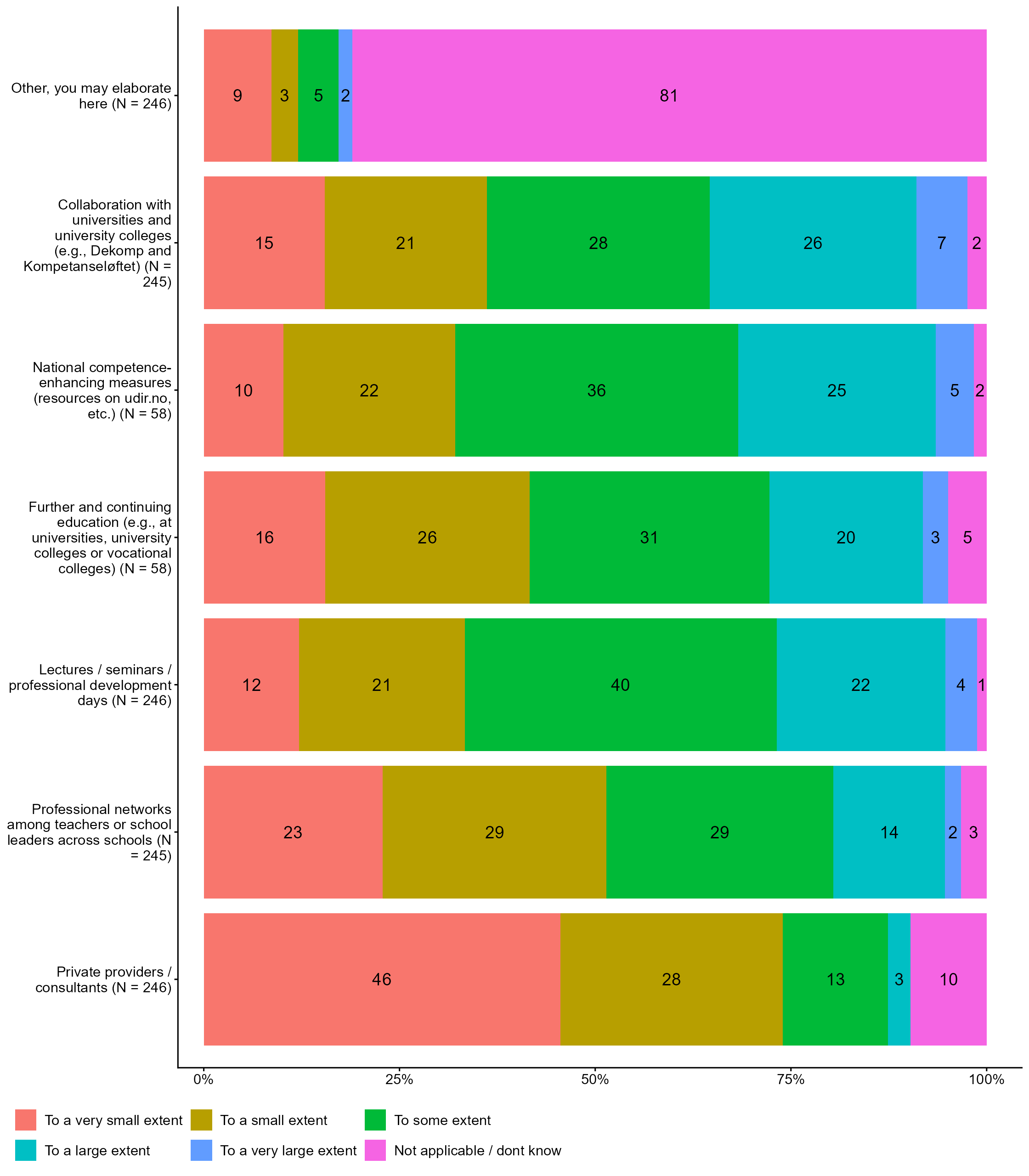 Figur 2.12.To what extent are staff at your school offered the following competence-enhancing measures in public health and life skills?. N = [58–246], Figurdata (XLSX), PNG. (SLQ22_1,SLQ22_2,SLQ22_3,SLQ22_4,SLQ22_5,SLQ22_6,SLQ22_7)
