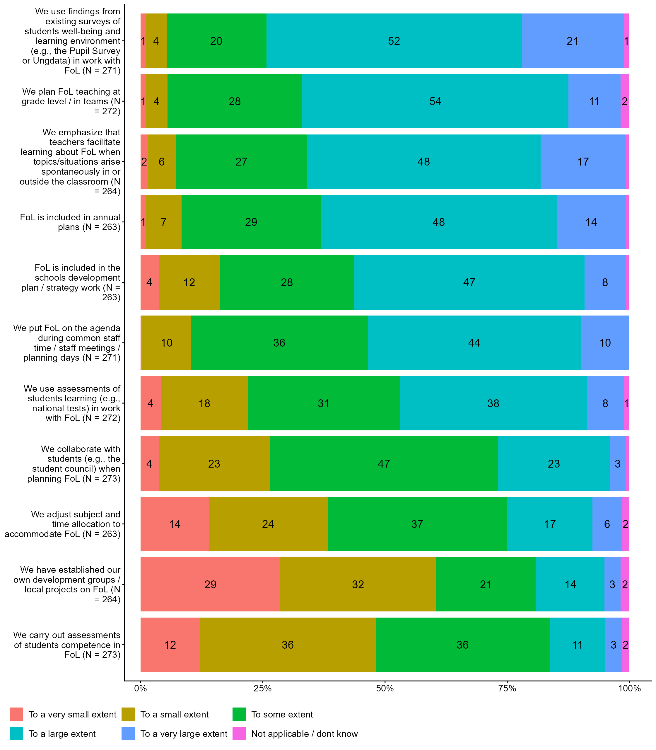 Figur 2.4.How do you work with public health and life skills (FoL) at your school?. N = [263–273], Figurdata (XLSX), PNG. (SLQ10_1,SLQ10_2,SLQ10_3,SLQ10_4,SLQ10_5,SLQ10_6,SLQ11_1,SLQ11_2,SLQ11_3,SLQ11_4,SLQ11_5)