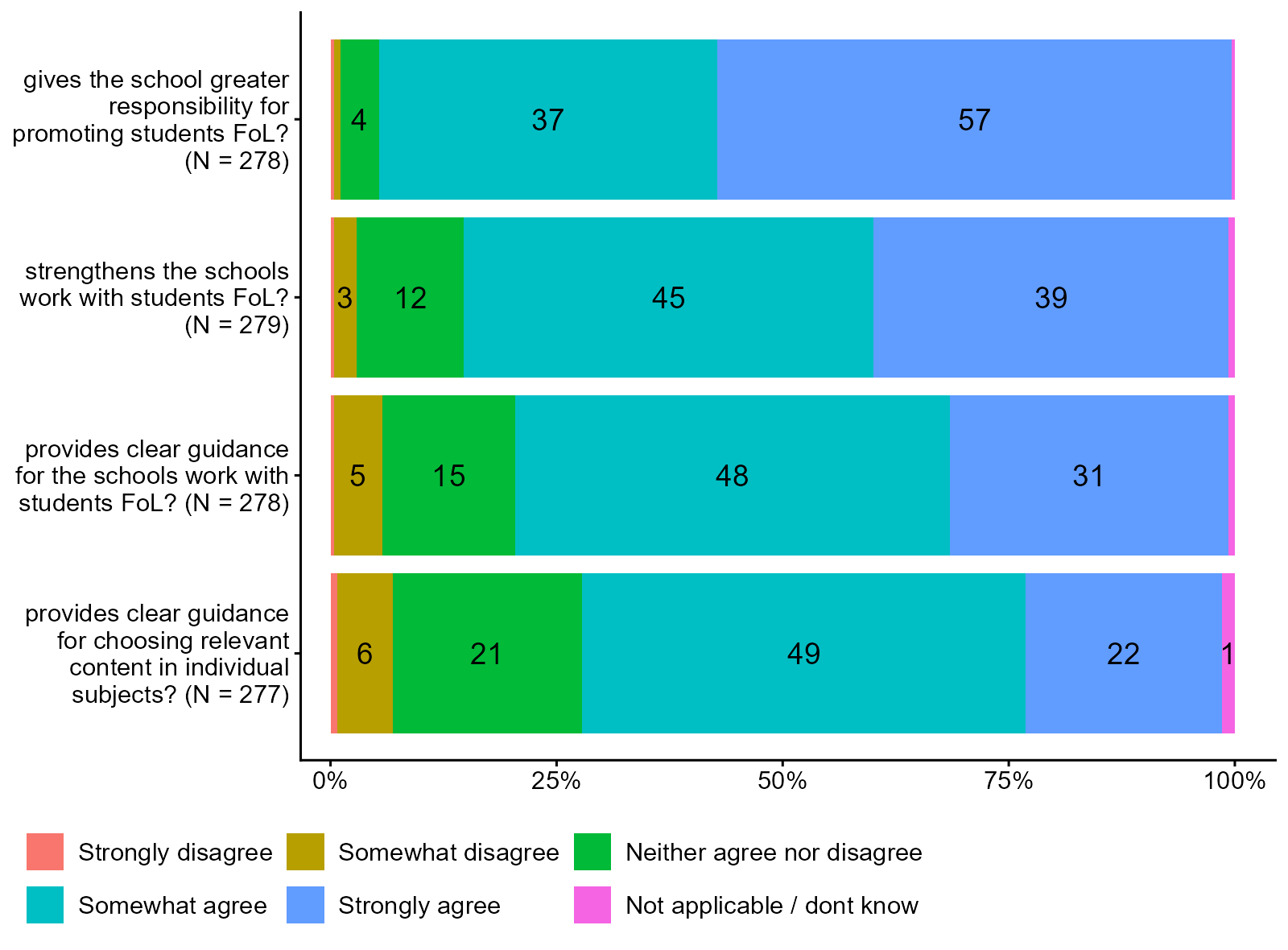 Figur 2.2.To what extent do you agree that the introduction of public health and life skills (FoL) in LK20. N = [277–279], Figurdata (XLSX), PNG. (SLQ7_1,SLQ7_2,SLQ7_3,SLQ7_4)