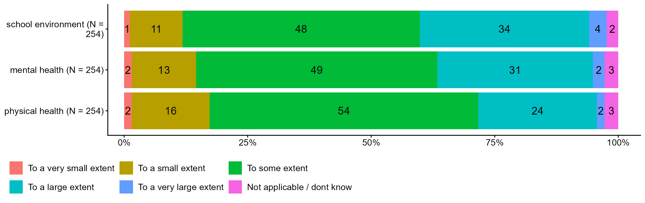 Figur 2.14.Overall, to what extent do you feel that the introduction of public health and life skills in LK20 has improved the school’s work with students’. N = 254, Figurdata (XLSX), PNG. (SLQ24_1,SLQ24_2,SLQ24_3)