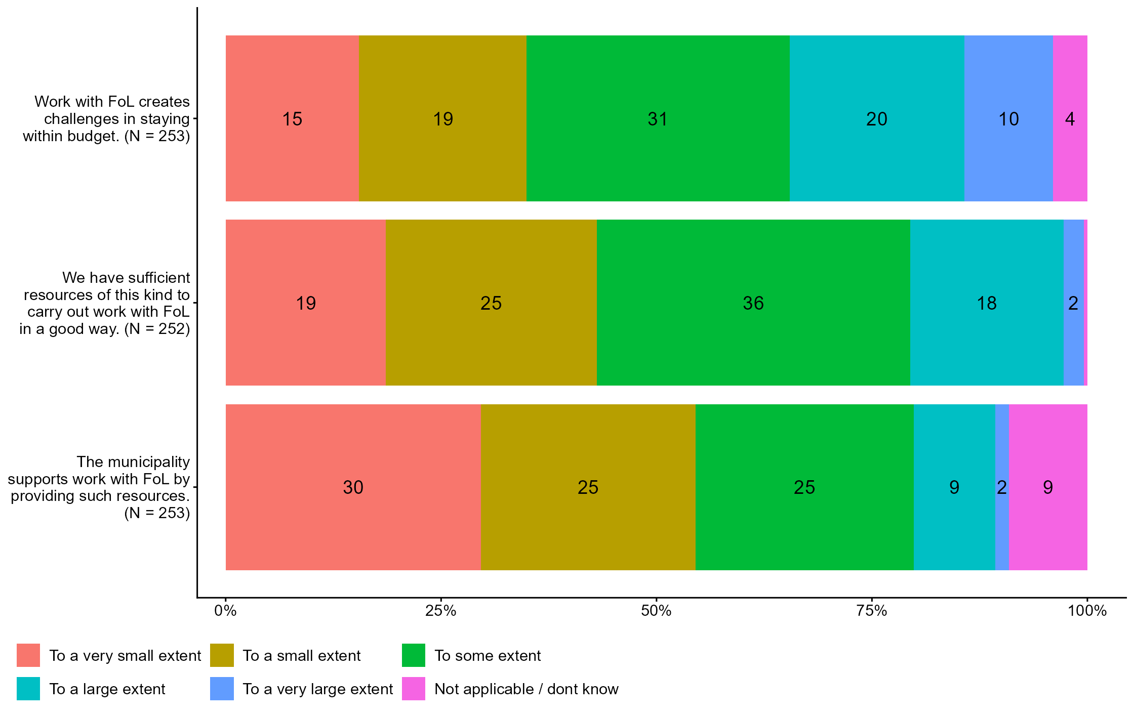 Figur 2.13.To what extent do you agree with the following statements about resource use related to work with public health and life skills (FoL)? By resources we mean, for example, financial support or extra preparation time, reduced teaching time for homeroom/contact teachers to follow up individual students, hiring professionals such as school support workers or milieu therapists to support work with relationships, conflict management and social initiatives.. N = [252–253], Figurdata (XLSX), PNG. (SLQ23_1,SLQ23_2,SLQ23_3)