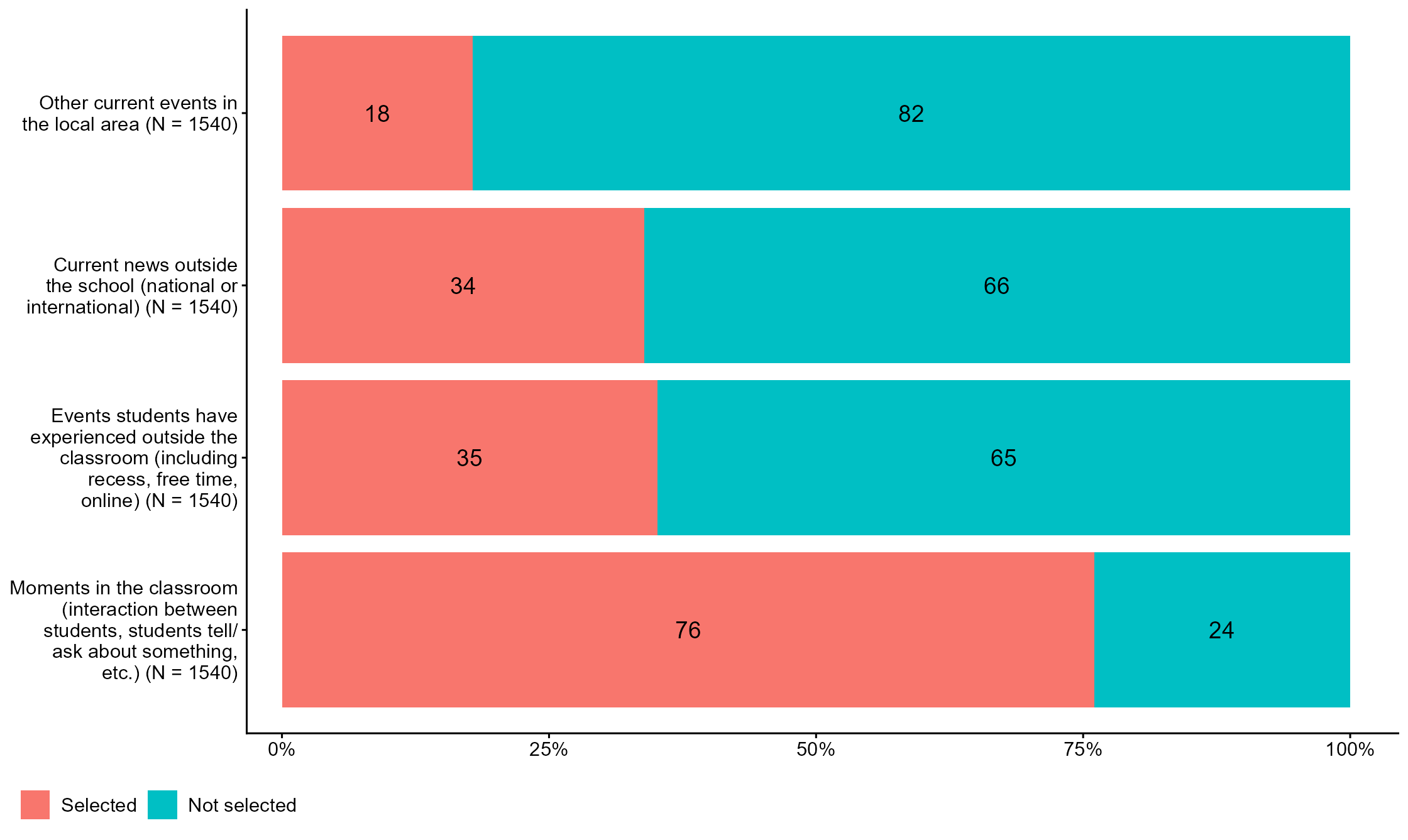 Figur 8.7.Which of the following categories describe the situation(s) that may have led to spontaneous inclusion of public health and life skills in the lesson?. N = 1540, Figurdata (XLSX), PNG. (Q_LG18_1,Q_LG18_2,Q_LG18_3,Q_LG18_4)