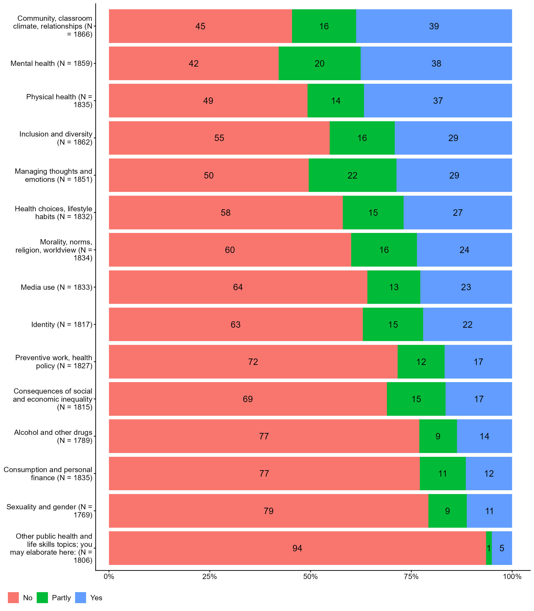 Figur 8.3.Did you include any of the following public health and life skills topics in this lesson?. N = [1769–1866], Figurdata (XLSX), PNG. (Q_LG14_1,Q_LG14_2,Q_LG14_3,Q_LG14_4,Q_LG14_5,Q_LG14_6,Q_LG14_7,Q_LG14_8,Q_LG14_9,Q_LG14_10,Q_LG14_11,Q_LG14_12,Q_LG14_13,Q_LG14_14,Q_LG14_15)