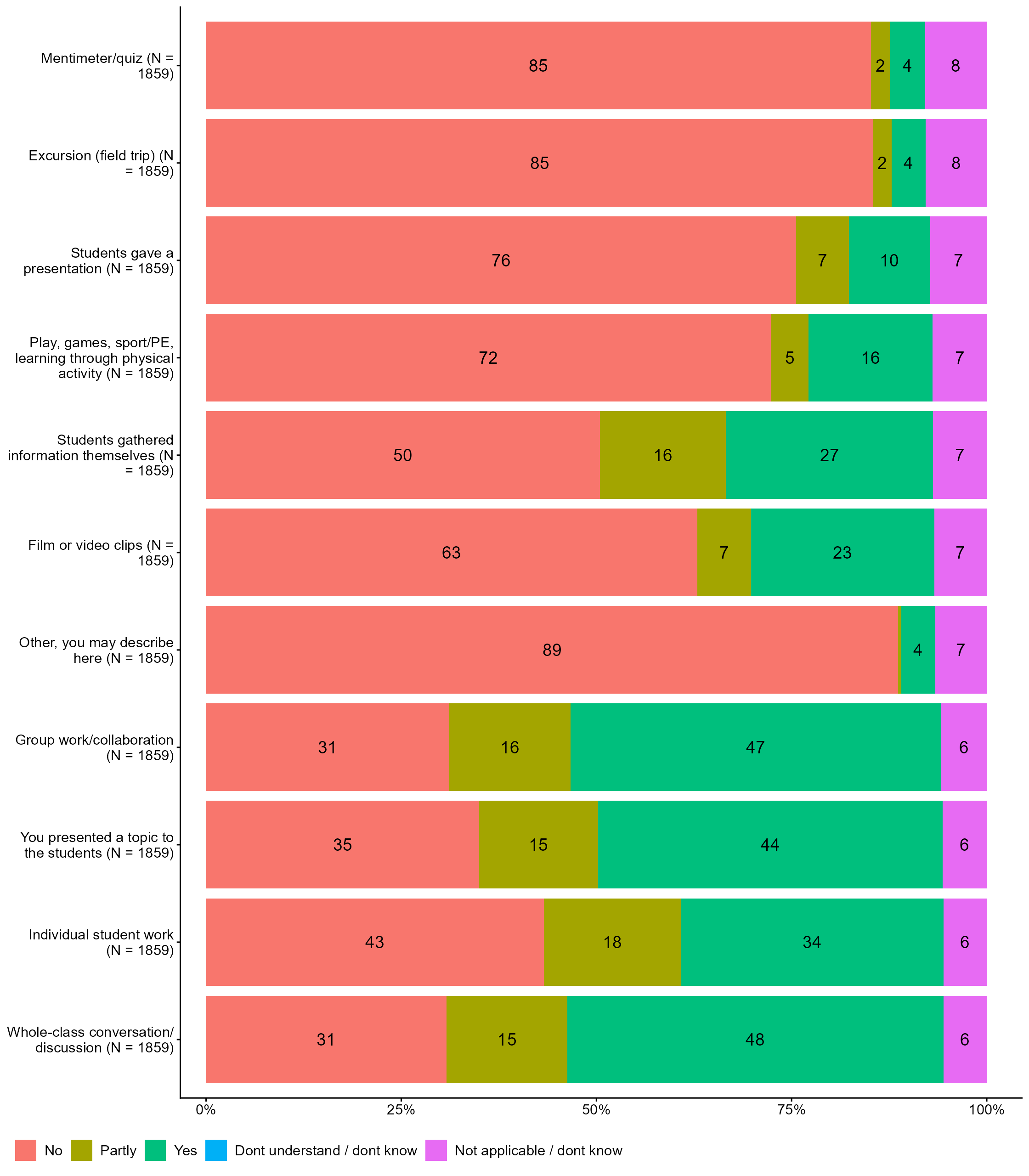 Figur 8.8.Did you use the following learning activities when you worked with public health and life skills in the lesson?. N = 1859, Figurdata (XLSX), PNG. (Q_LG19_1,Q_LG19_2,Q_LG19_3,Q_LG19_4,Q_LG19_5,Q_LG19_6,Q_LG19_7,Q_LG19_8,Q_LG19_9,Q_LG19_10,Q_LG19_11)