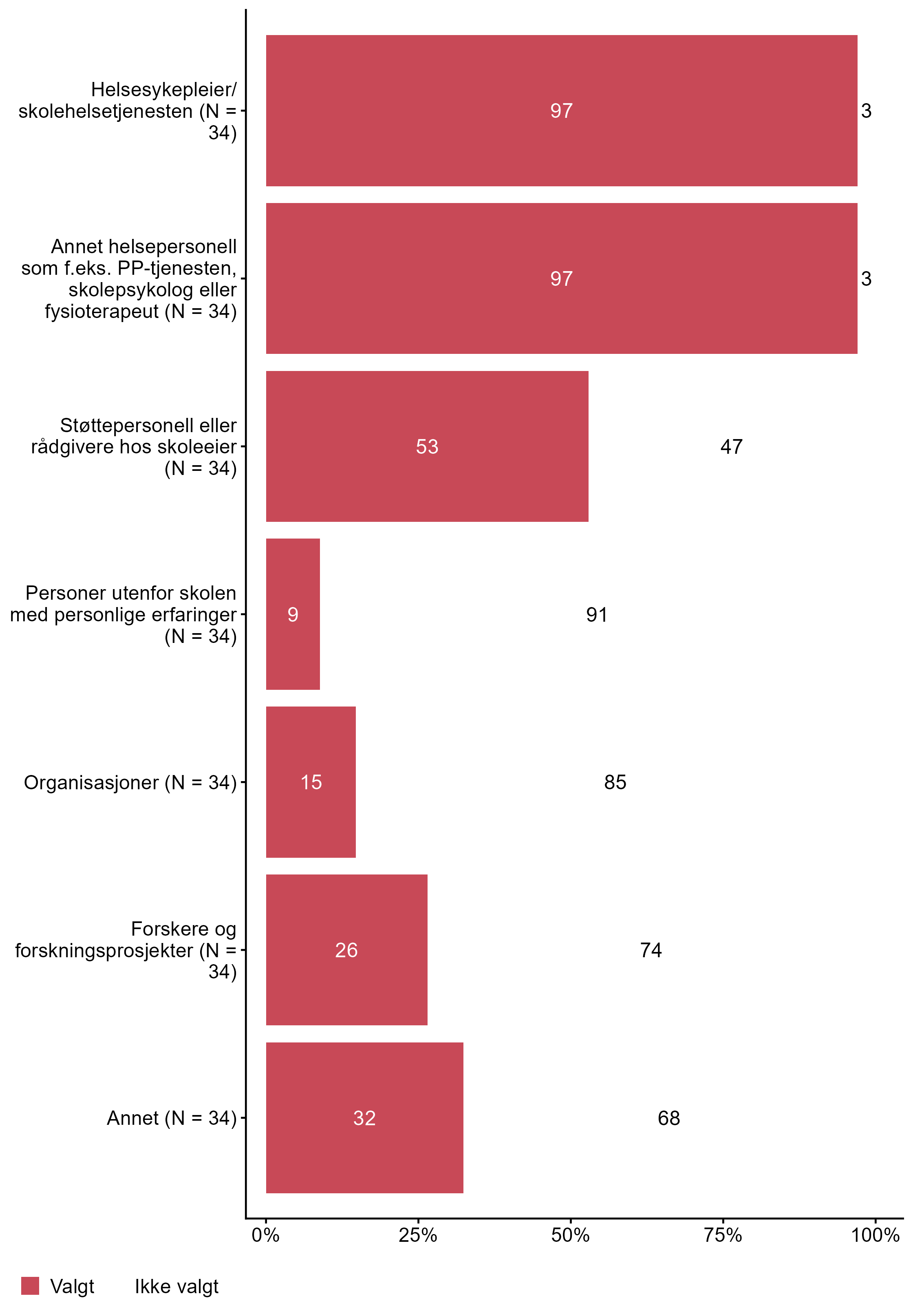 Figur 1.11.Hvilke ressurspersoner utenfor skolens egne ansatte har dere anbefalt å benytte i arbeidet med folkehelse og livsmestring.. N = 34, Figur (PNG), Figurdata (XLSX). (SEQ17_1, SEQ17_2, SEQ17_3, SEQ17_4, SEQ17_5, SEQ17_6, SEQ17_7)