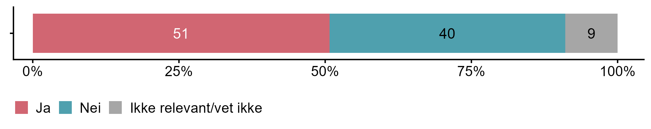 Figur 1.10.Har dere gitt anbefalinger knyttet til hvilke ressurspersoner som skal benyttes i arbeid med folkehelse og livsmestring?. N = 67, Figur (PNG), Figurdata (XLSX). (SEQ16)