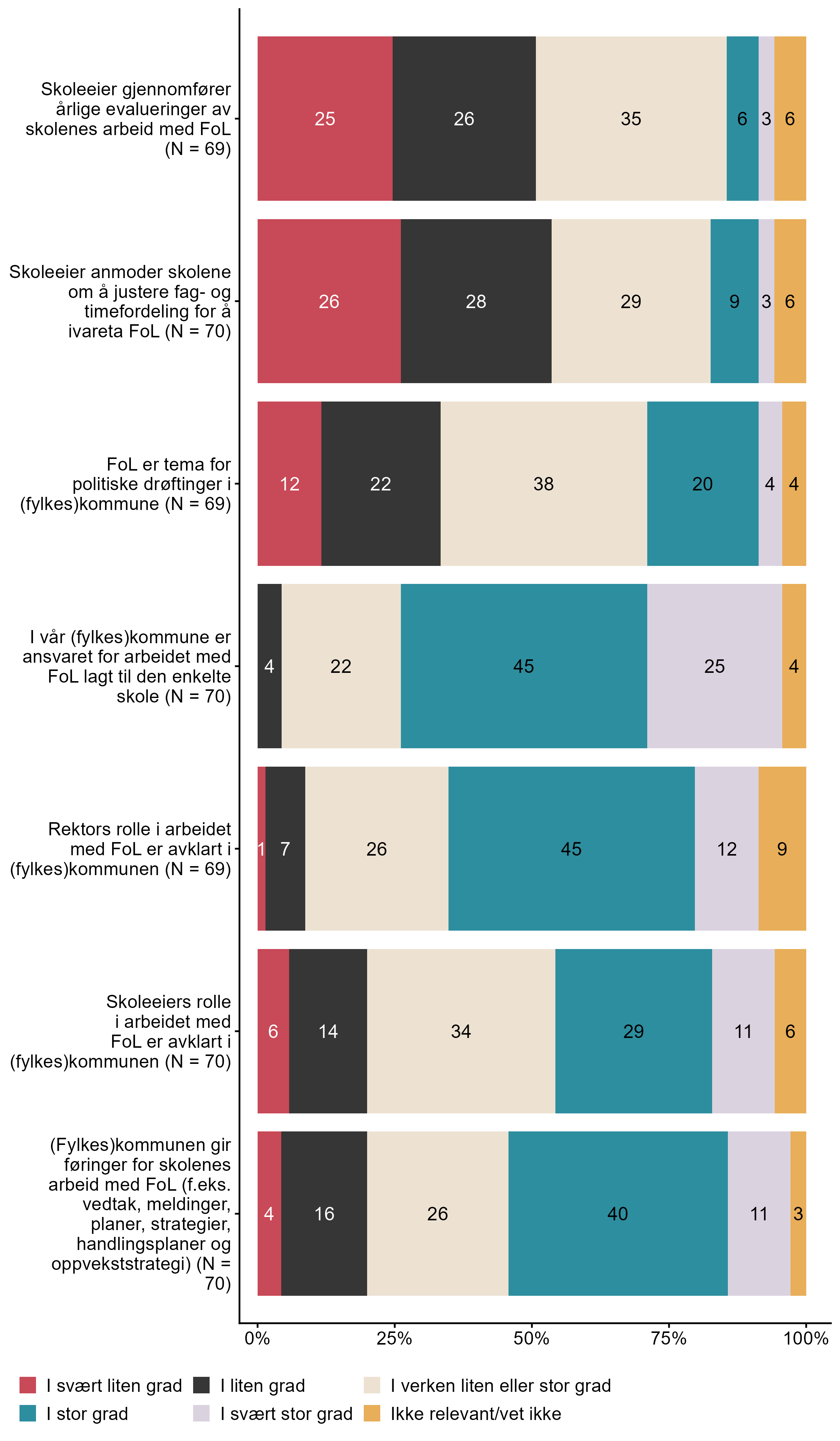 Figur 1.6.Nedenfor har vi listet opp noen påstander om arbeidet med folkehelse og livsmestring (FoL) som foretas av skoleeier. I hvilken grad passer de for din (fylkes)kommune?. N = [69–70], Figur (PNG), Figurdata (XLSX). (SEQ12_1,SEQ12_2,SEQ12_3,SEQ12_4,SEQ12_5,SEQ12_6,SEQ12_7)