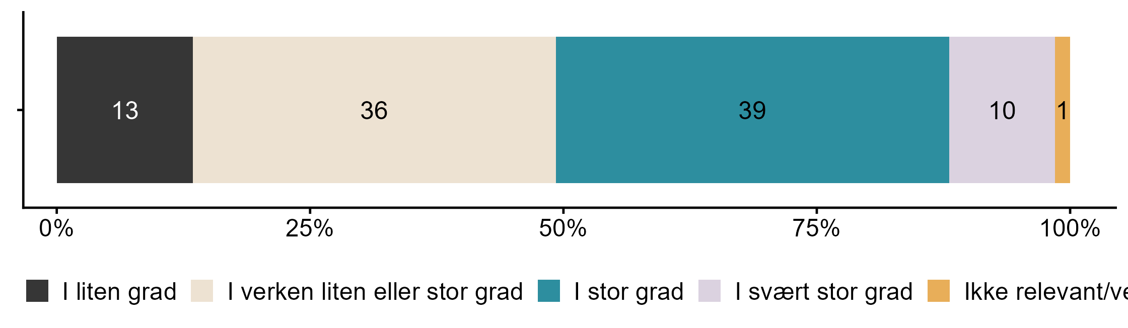 Figur 1.9.I hvilken grad forventer dere som skoleeier at skolene benytter ressurspersoner utover skolens egne ansatte i arbeidet med folkehelse og livsmestring?. N = 67, Figur (PNG), Figurdata (XLSX). (SEQ15)