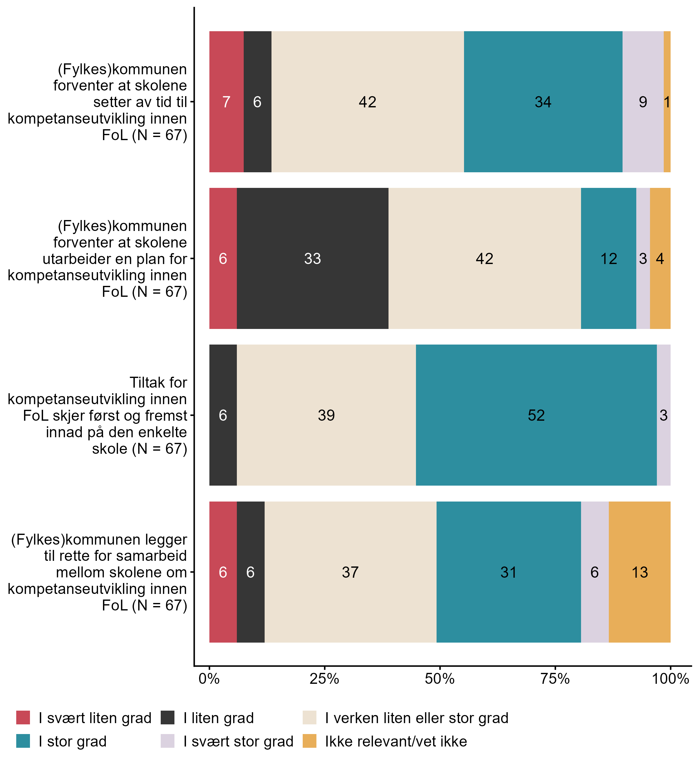 Figur 1.7.I hvilken grad er du enig i følgende utsagn om kompetanseutvikling innen folkehelse og livsmestring (FoL)?. N = 67, Figur (PNG), Figurdata (XLSX). (SEQ13_1,SEQ13_2,SEQ13_3,SEQ13_4)