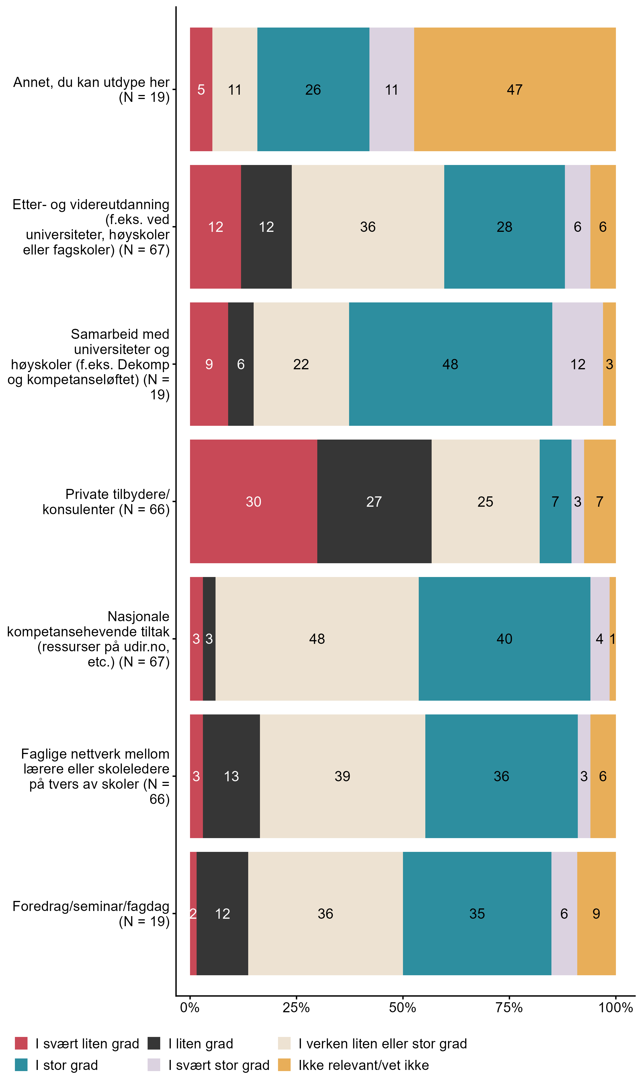 Figur 1.8.I hvilken grad har ansatte i skoler i din (fylkes)kommune fått tilbud om følgene kompetansehevende tiltak innen folkehelse og livsmestring?. N = [19–67], Figur (PNG), Figurdata (XLSX). (SEQ14_1,SEQ14_2,SEQ14_3,SEQ14_4,SEQ14_5,SEQ14_6,SEQ14_7)