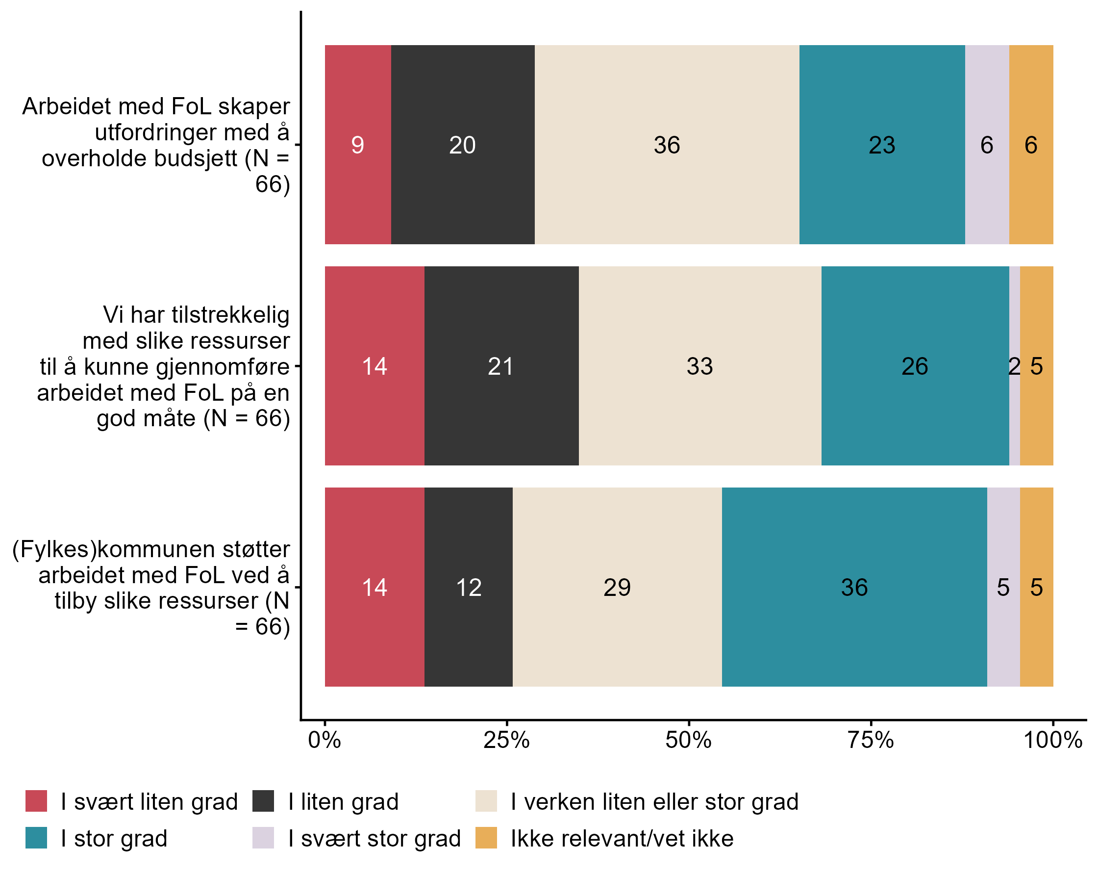 Figur 1.13.I hvilken grad er du enig i følgende påstander om ressursbruk tilknyttet arbeidet med folkehelse og livsmestring (FoL)? Med ressurser mener vi for eksempel økonomisk støtte eller ekstra tid til forberedelser, redusert undervisningstid for kontaktlærere for å følge opp enkeltelever, ansettelse av fagpersoner som miljøarbeidere eller miljøterapeuter som støtter arbeidet med relasjoner, konflikthåndtering og sosiale tiltak.. N = 66, Figur (PNG), Figurdata (XLSX). (SEQ19_1,SEQ19_2,SEQ19_3)