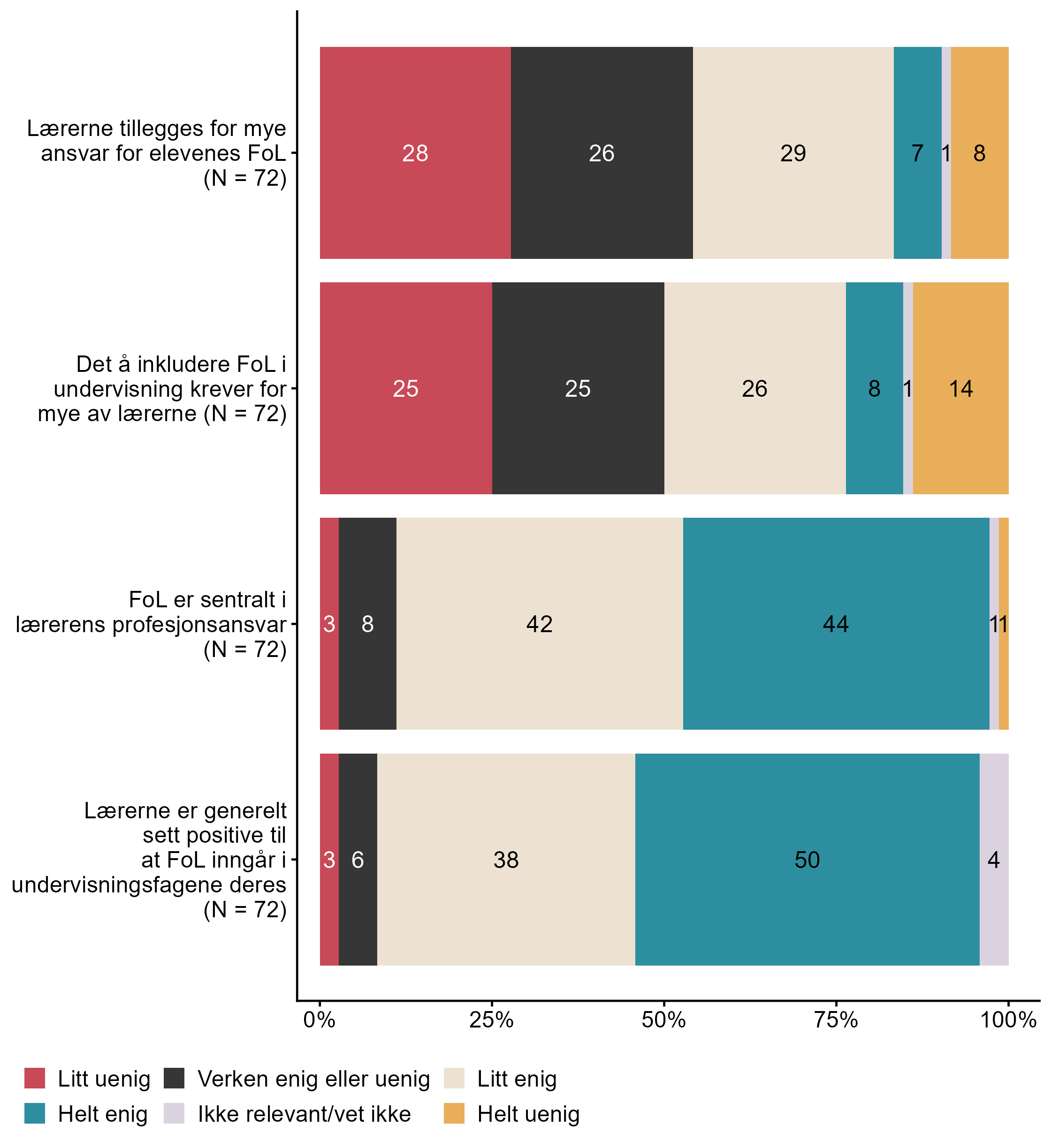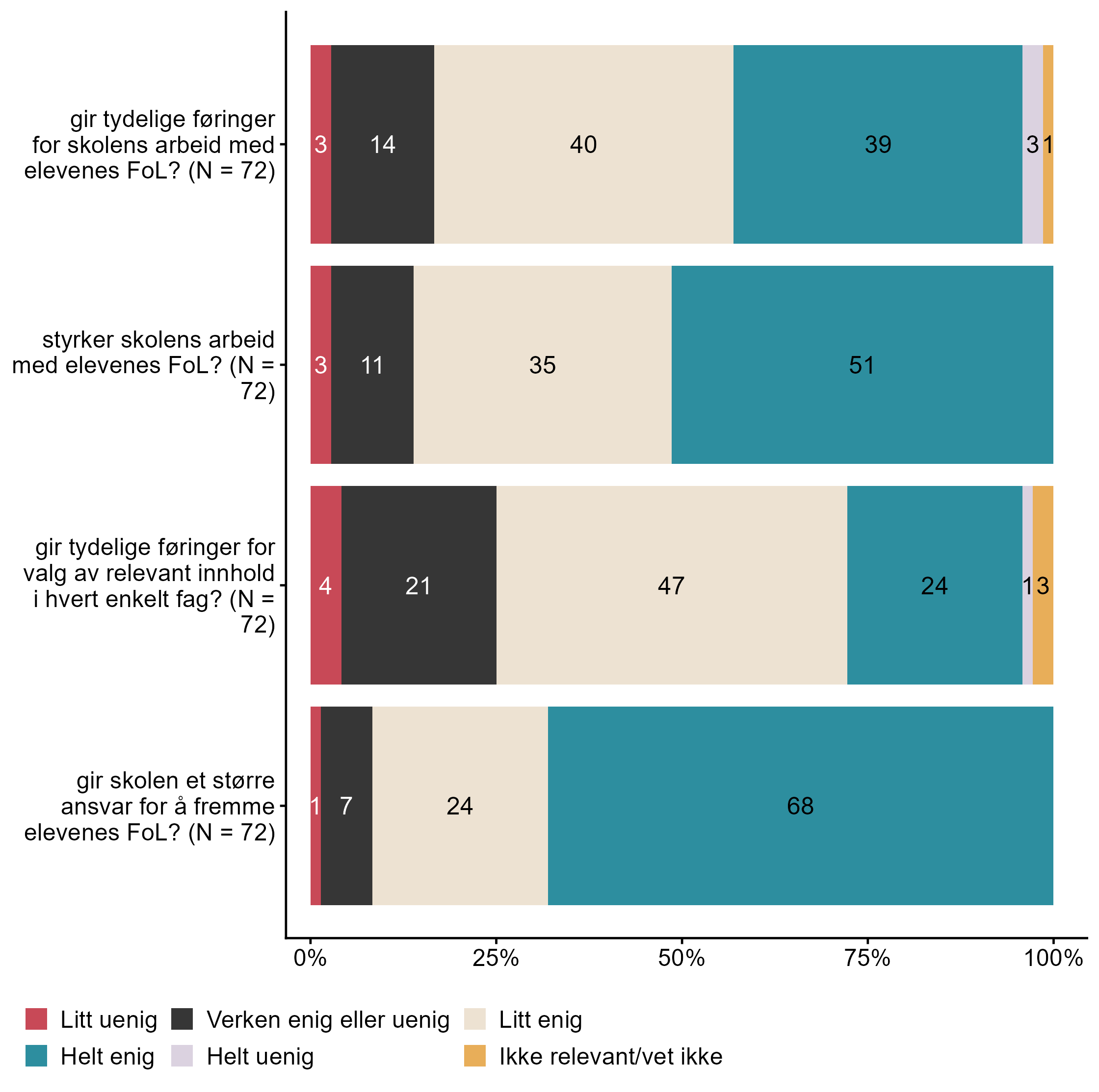 Figur 1.4.Hvor enig er du i at innføringen av folkehelse og livsmestring (FoL) i LK20. N = 72, Figur (PNG), Figurdata (XLSX). (SEQ9_1,SEQ9_2,SEQ9_3,SEQ9_4)