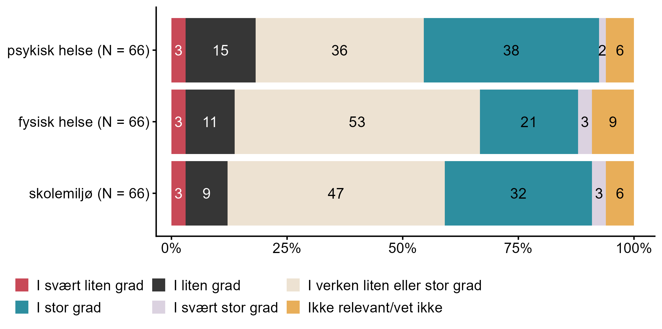 Figur 1.14.Alt i alt, i hvilken grad opplever du at innføringen av folkehelse og livsmestring i LK20 har forbedret skolens arbeid med elevenes. N = 66, Figur (PNG), Figurdata (XLSX). (SEQ20_1,SEQ20_2,SEQ20_3)