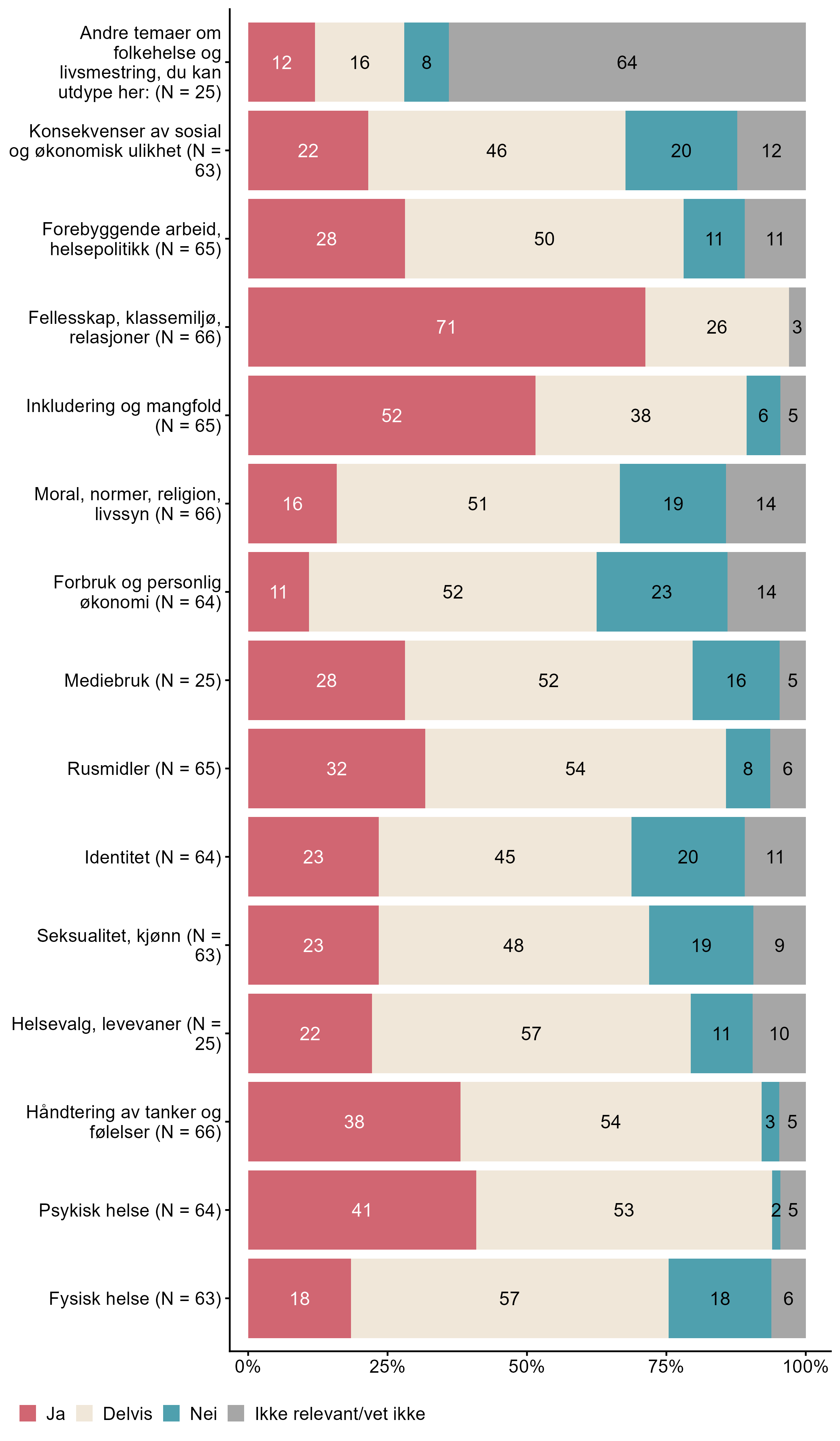 Figur 1.12.Tilbyr (fylkes)kommunen faglig utvikling for ansatte i skoler angående noen av følgende temaer?. N = [25–66], Figur (PNG), Figurdata (XLSX). (SEQ18_1,SEQ18_2, SEQ18_3,SEQ18_4, SEQ18_5,SEQ18_6, SEQ18_7,SEQ18_8, SEQ18_9,SEQ18_10, SEQ18_11,SEQ18_12, SEQ18_13,SEQ18_14, SEQ18_15)