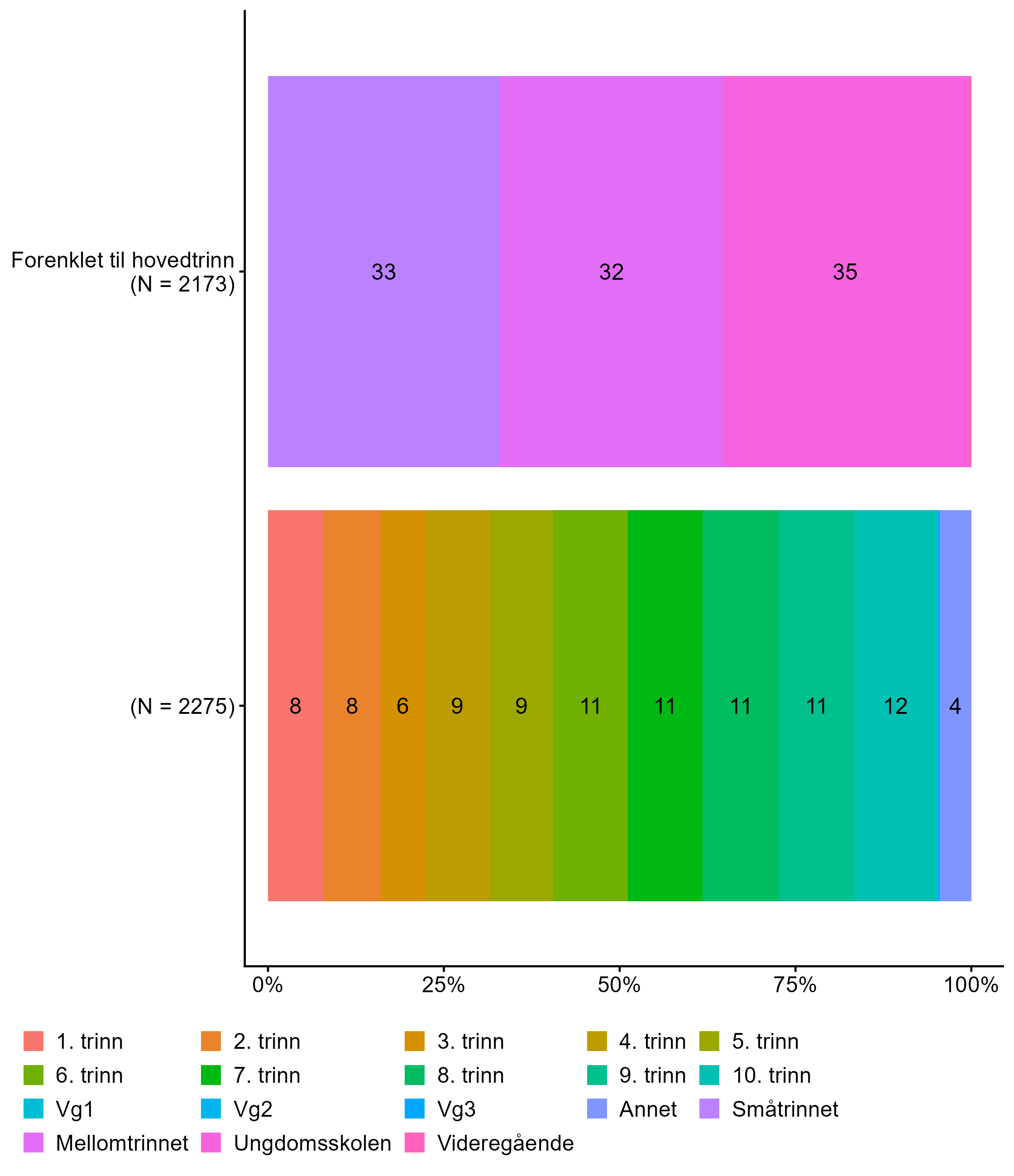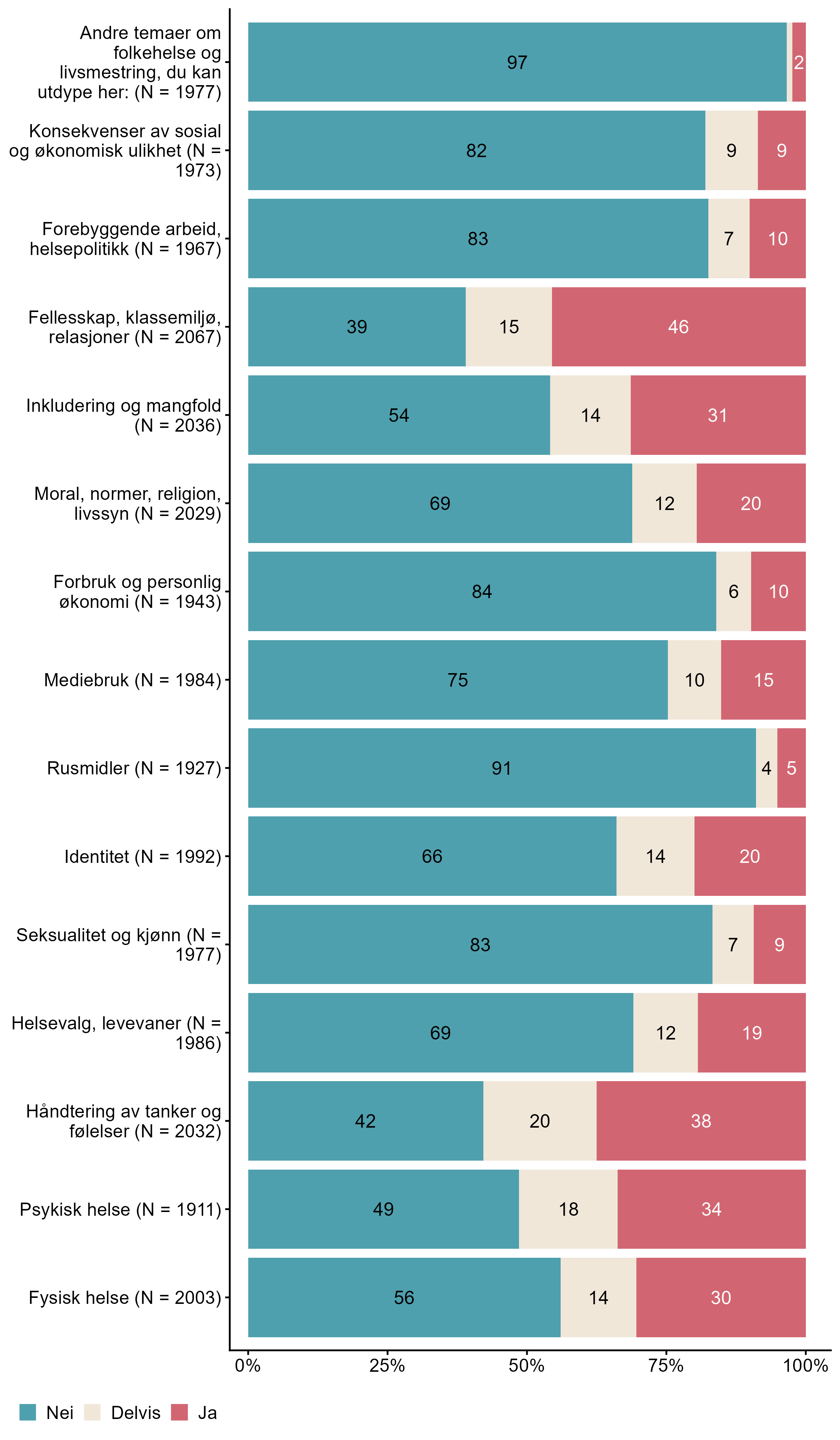 Figur 4.3.Inkluderte du noen av disse temaene om folkehelse og livsmestring i denne økten?. N = [1911–2067], Figur (PNG), Figurdata (XLSX). (Q_LG14_1, Q_LG14_2, Q_LG14_3, Q_LG14_4, Q_LG14_5, Q_LG14_6, Q_LG14_7, Q_LG14_8, Q_LG14_9, Q_LG14_10, Q_LG14_11, Q_LG14_12, Q_LG14_13, Q_LG14_14, Q_LG14_15)