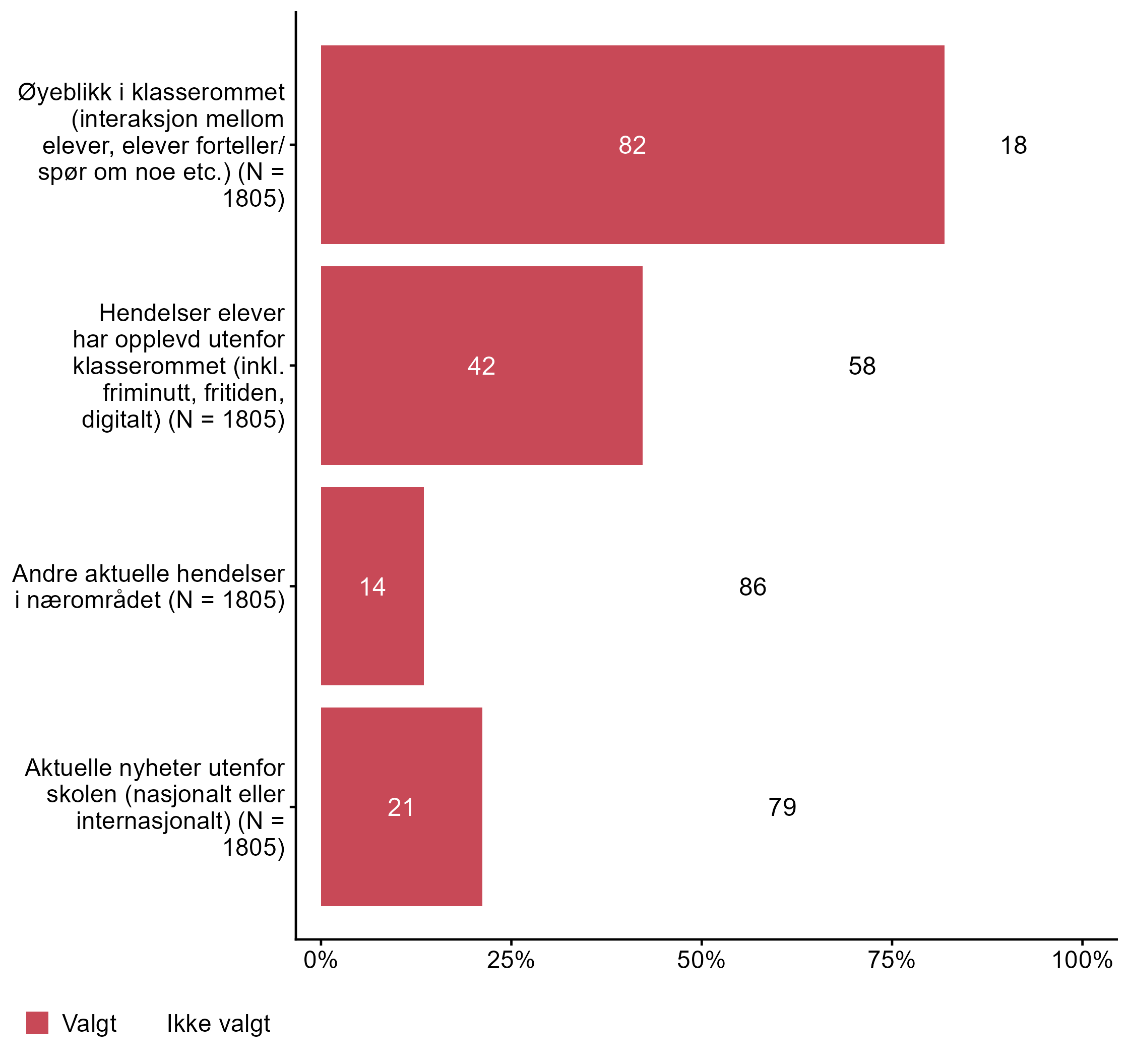 Figur 4.7.Hvilke av de følgende kategoriene kan beskrive situasjonen(e) som eventuelt førte til spontan inkludering av folkehelse og livsmestring i økten?. N = 1805, Figur (PNG), Figurdata (XLSX). (Q_LG18_1,Q_LG18_2,Q_LG18_3,Q_LG18_4)