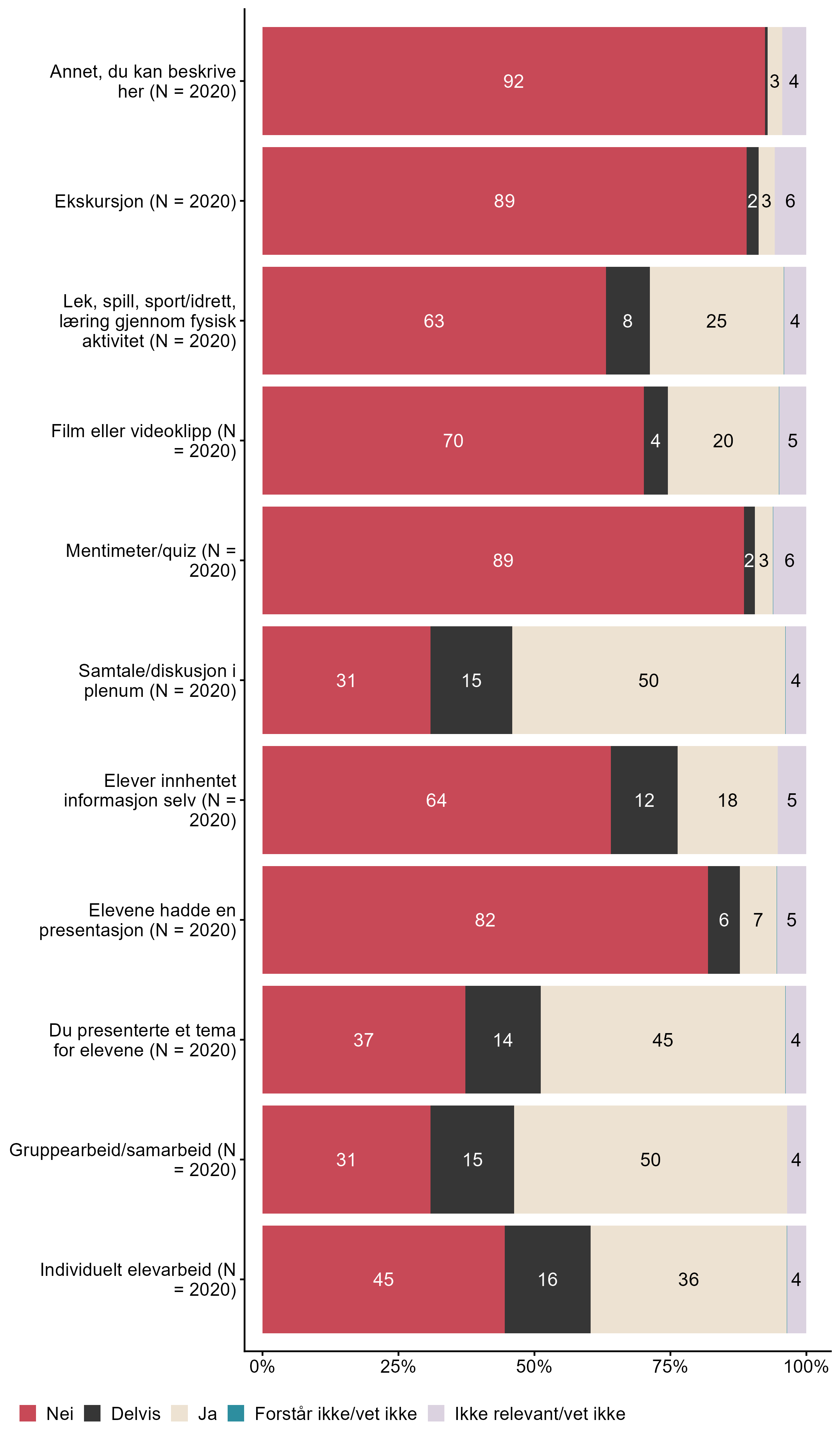Figur 4.8.Brukte du følgende læringsaktiviteter da du jobbet med folkehelse og livsmestring i økten?. N = 2020, Figur (PNG), Figurdata (XLSX). (Q_LG19_1,Q_LG19_2,Q_LG19_3,Q_LG19_4,Q_LG19_5,Q_LG19_6,Q_LG19_7,Q_LG19_8,Q_LG19_9,Q_LG19_10,Q_LG19_11)
