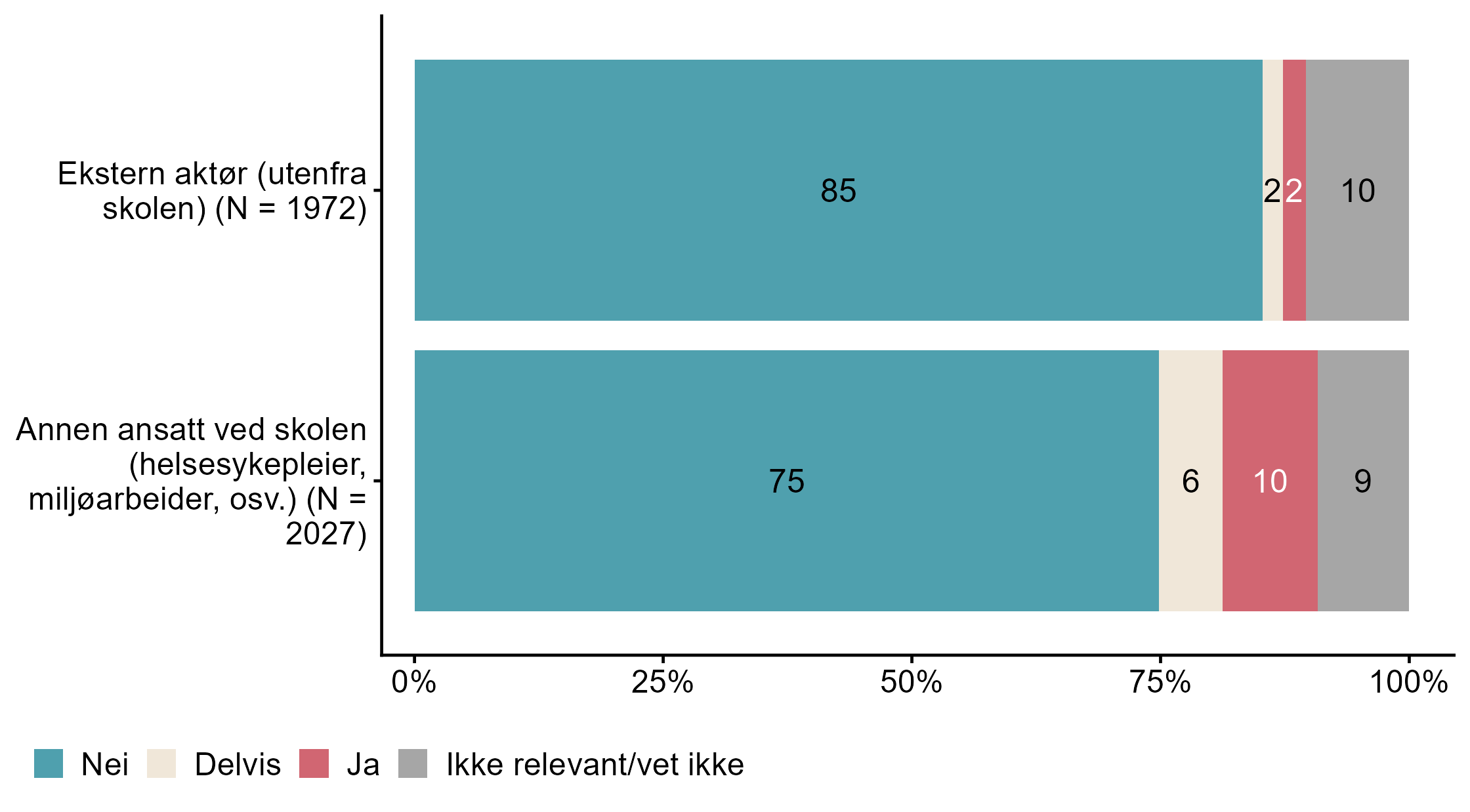 Figur 4.5.Benyttet du andre personer da du inkluderte folkehelse og livsmestring (FoL) i økten?. N = [1972–2027], Figur (PNG), Figurdata (XLSX). (Q_LG16_1,Q_LG16_2)
