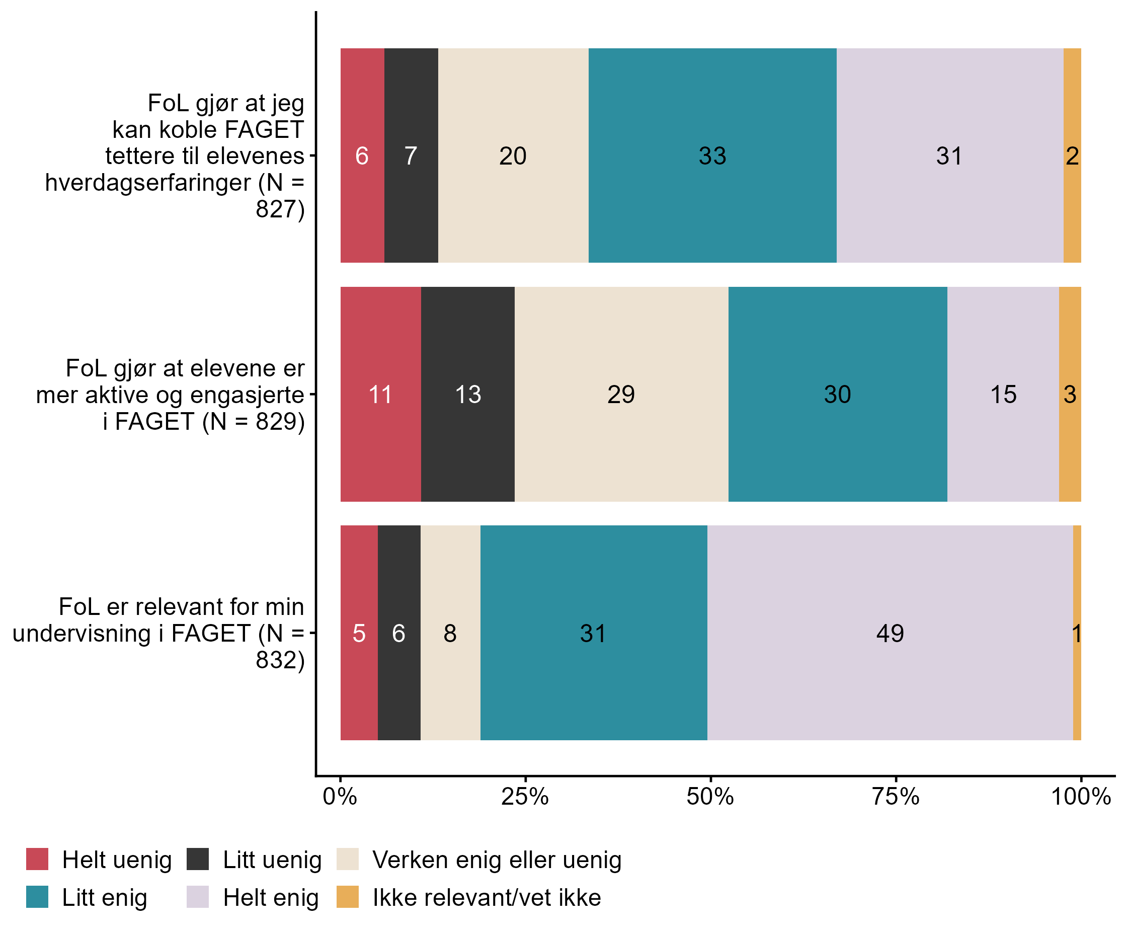 Figur 7.7.Hvor uenig/enig er du i følgende utsagn om arbeidet med folkehelse og livsmestring (FoL) i FAGET?. N = [827–832], Figur (PNG), Figurdata (XLSX). (Q_LS19_1,Q_LS19_2,Q_LS19_3)