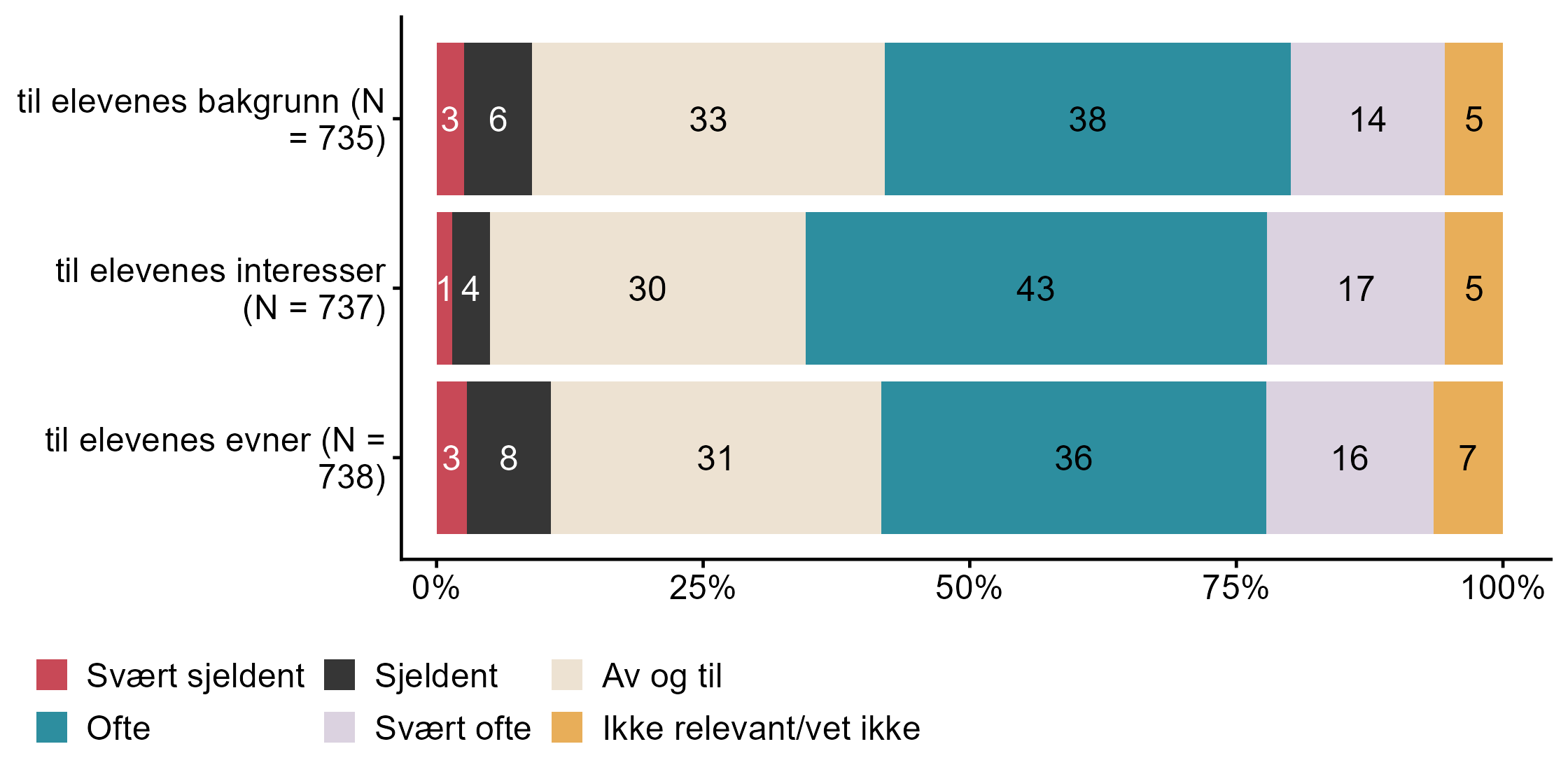 Figur 7.17.Hvor ofte tilpasser du arbeidet med folkehelse og livsmestring. N = [735–738], Figur (PNG), Figurdata (XLSX). (Q_LS33_1,Q_LS33_2,Q_LS33_3)