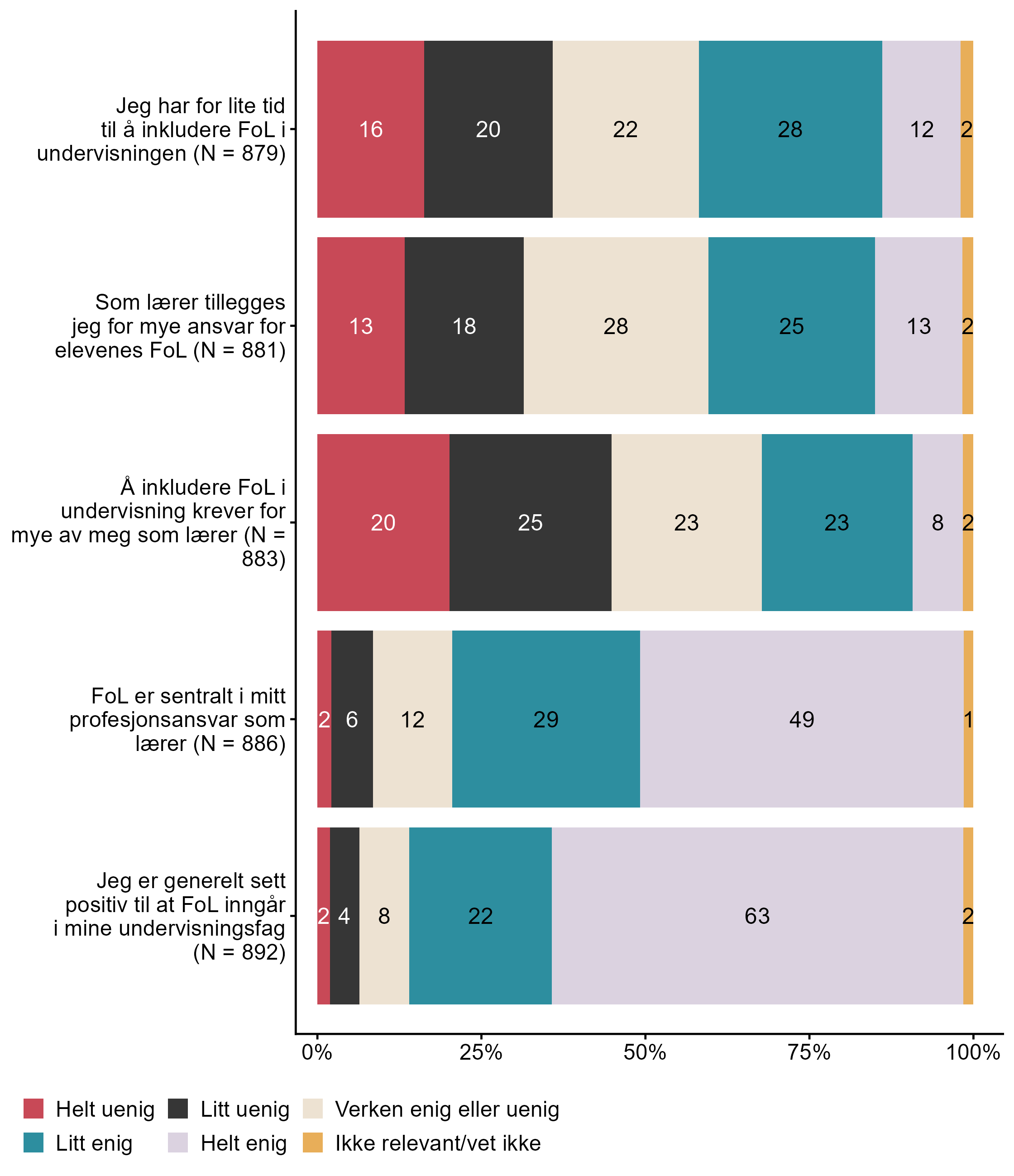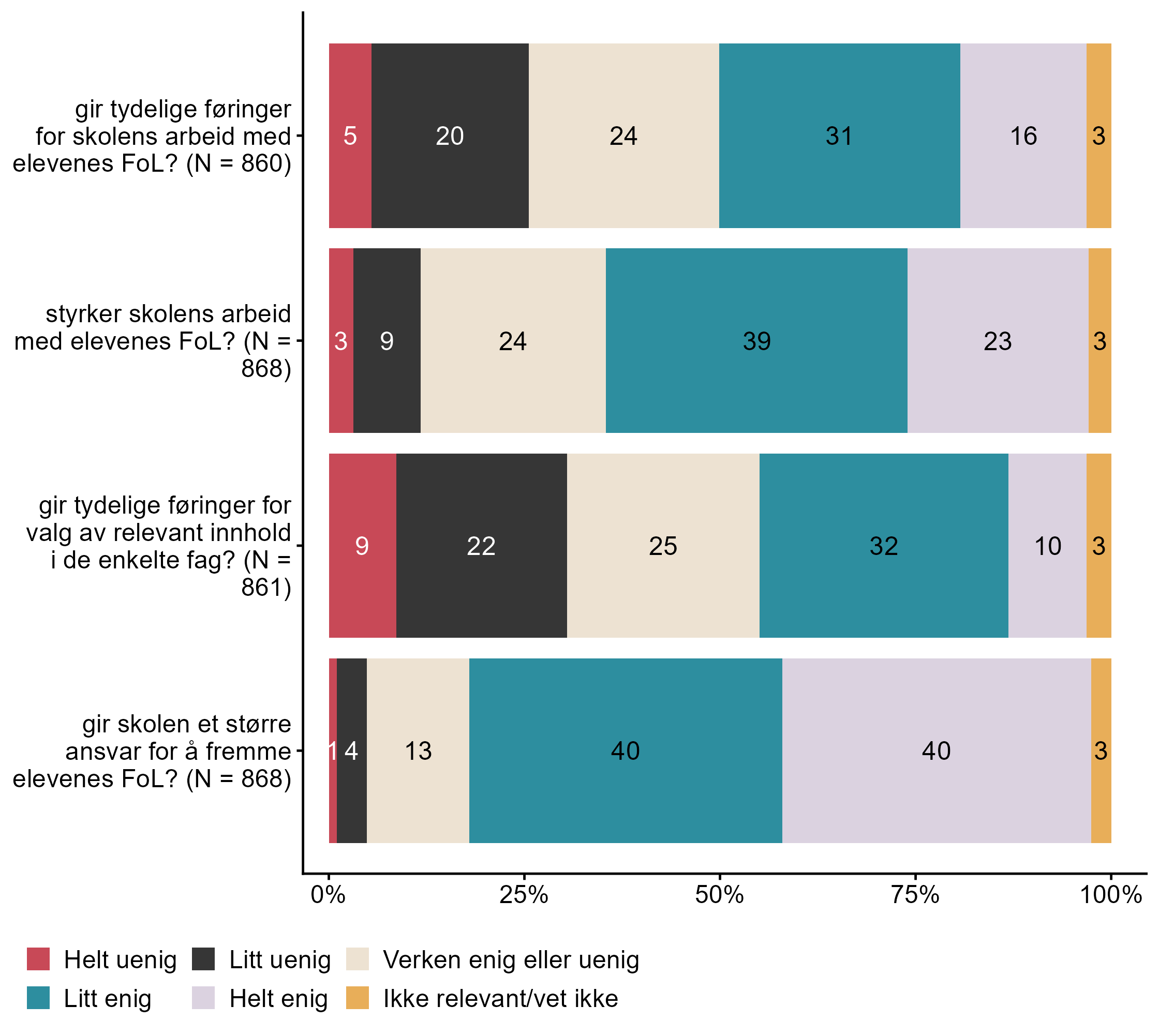 Figur 7.5.Hvor enig er du i at innføringen av folkehelse og livsmestring (FoL) i LK20. N = [860–868], Figur (PNG), Figurdata (XLSX). (Q_LS17_1,Q_LS17_2,Q_LS17_3,Q_LS17_4)