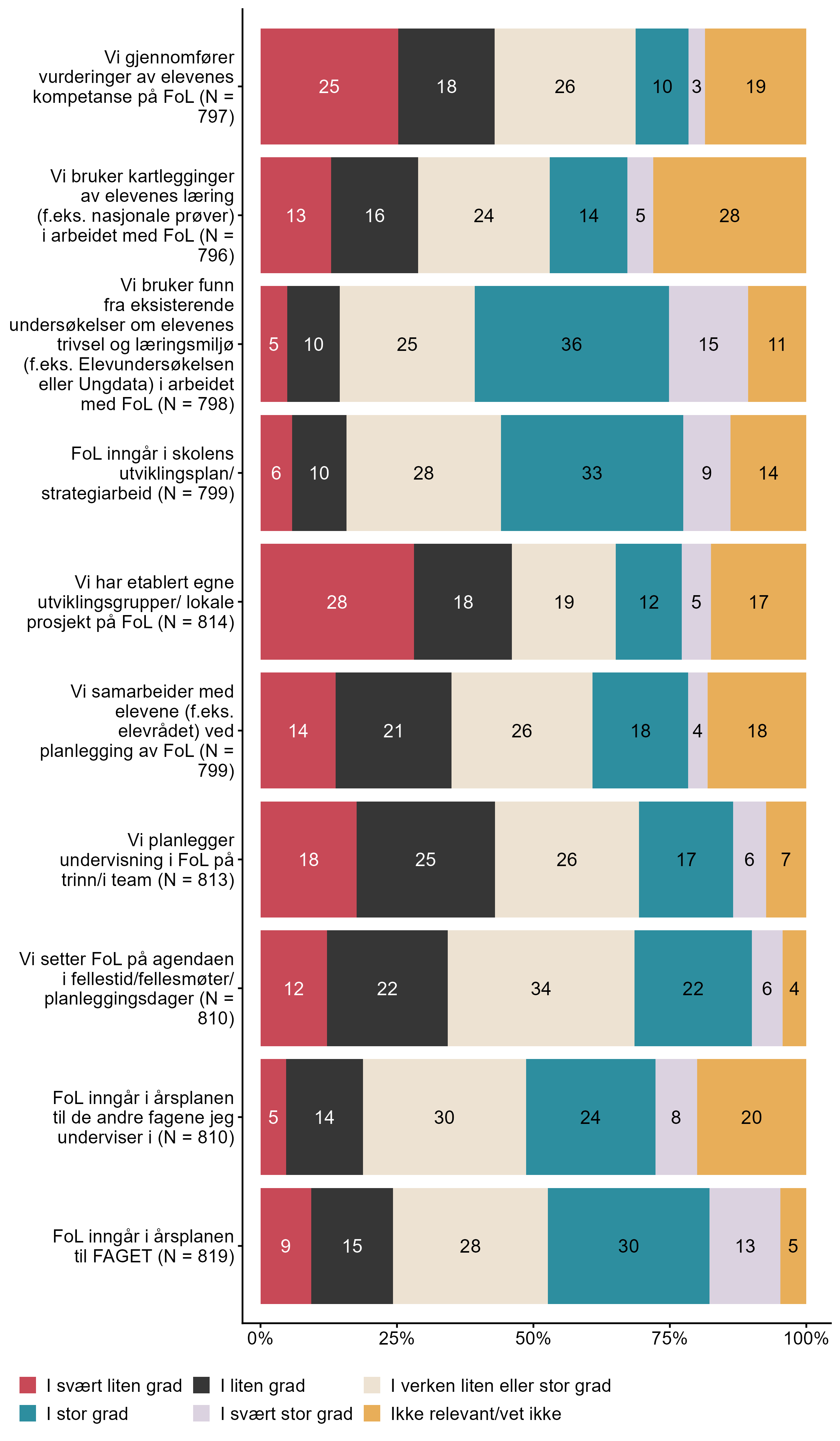 Figur 7.8.Hvordan arbeider dere ved din skole med folkehelse og livsmestring (FoL)?. N = [796–819], Figur (PNG), Figurdata (XLSX). (Q_LS21_1,Q_LS21_2,Q_LS21_3,Q_LS21_4,Q_LS21_5,Q_LS21_6,Q_LS22_1,Q_LS22_2,Q_LS22_3,Q_LS22_4)