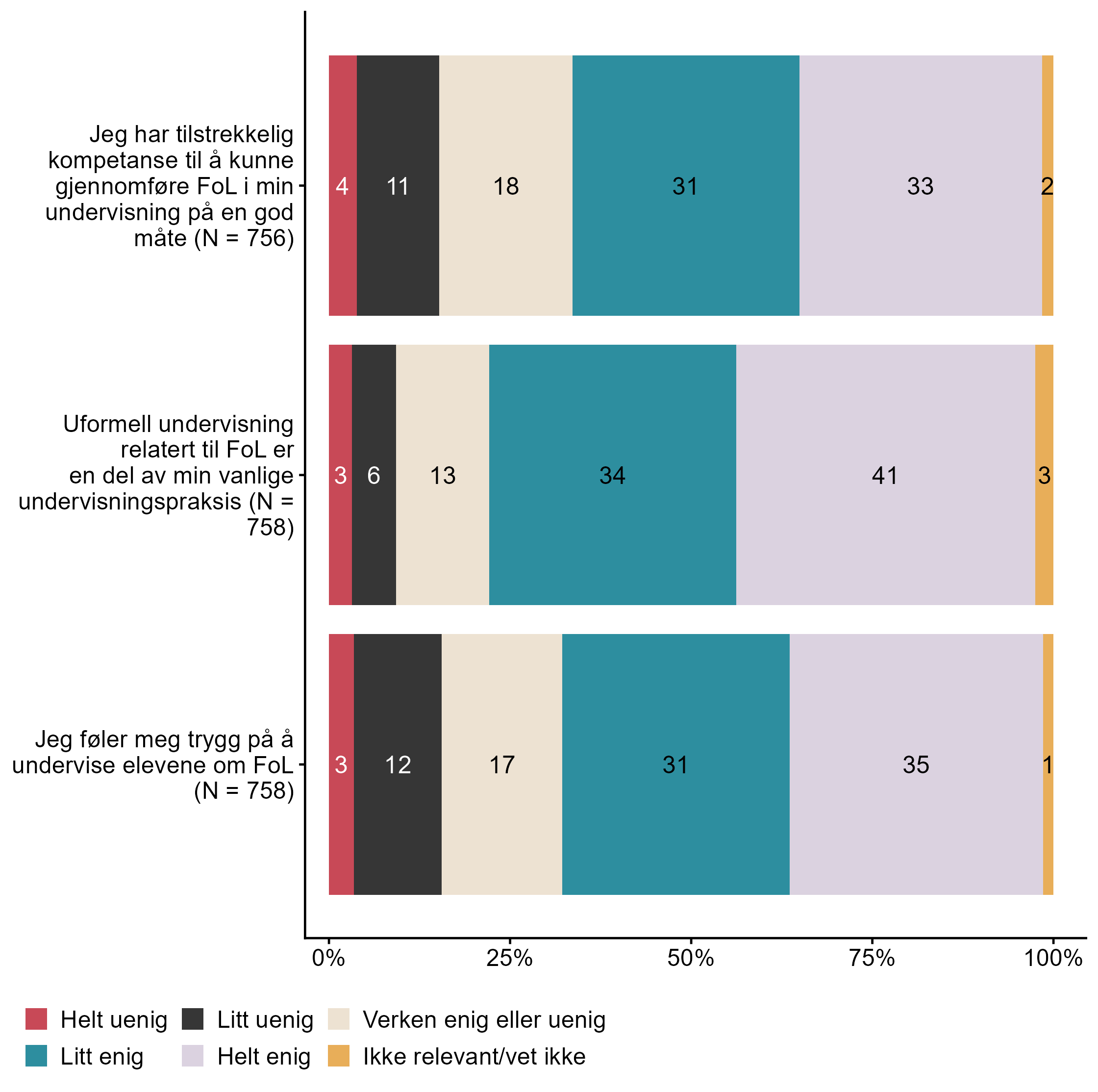 Figur 7.12.Hvor enig er du i følgende påstander om din kompetanse i folkehelse og livsmestring (FoL)?. N = [756–758], Figur (PNG), Figurdata (XLSX). (Q_LS27_1,Q_LS27_2,Q_LS27_3)