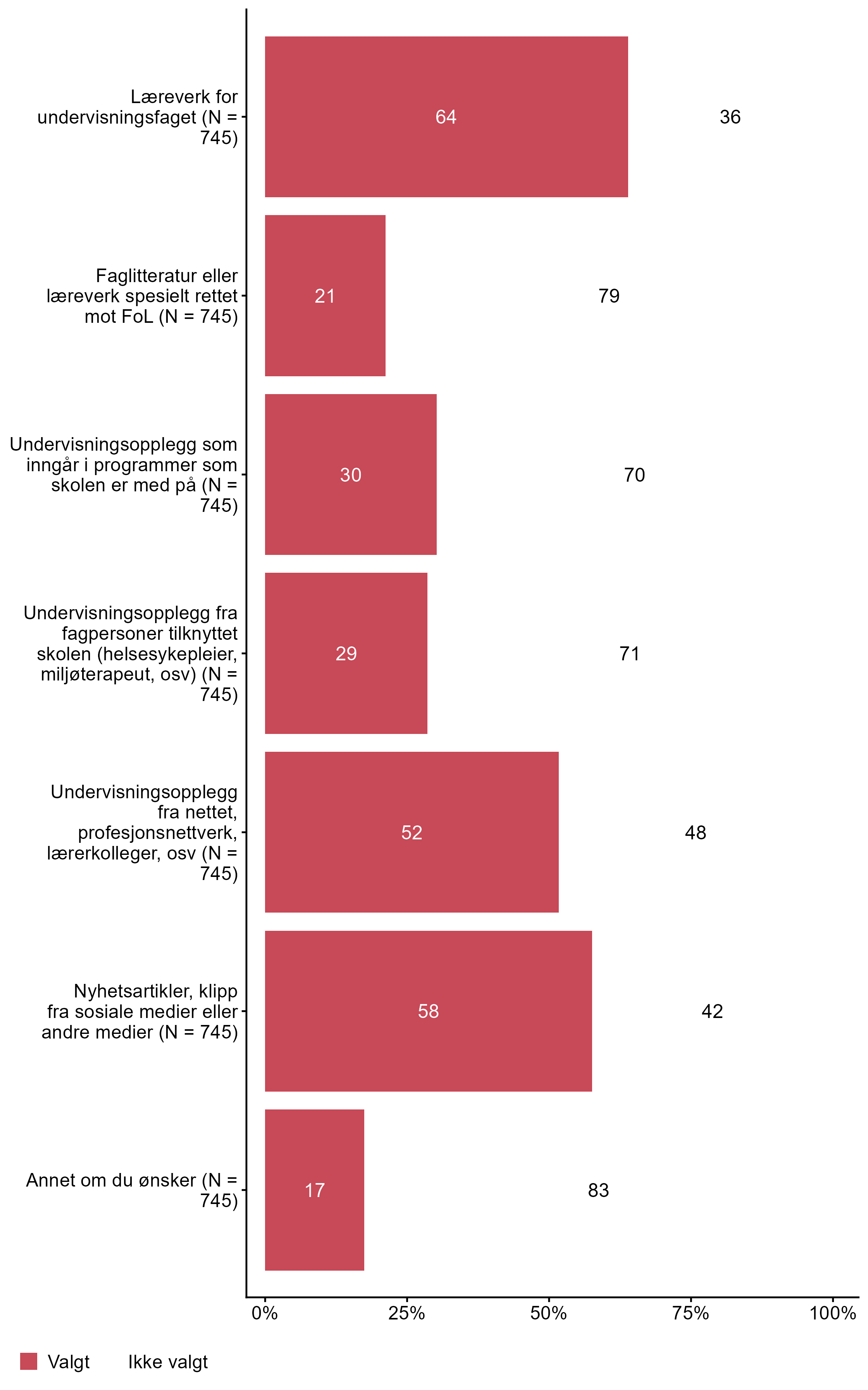 Figur 7.10.Hvilke kilder benytter du vanligvis til å undervise i folkehelse og livsmestring (FoL) i FAGET.. N = 745, Figur (PNG), Figurdata (XLSX). (Q_LS24_1,Q_LS24_28,Q_LS24_29,Q_LS24_30,Q_LS24_31,Q_LS24_32,Q_LS24_33)