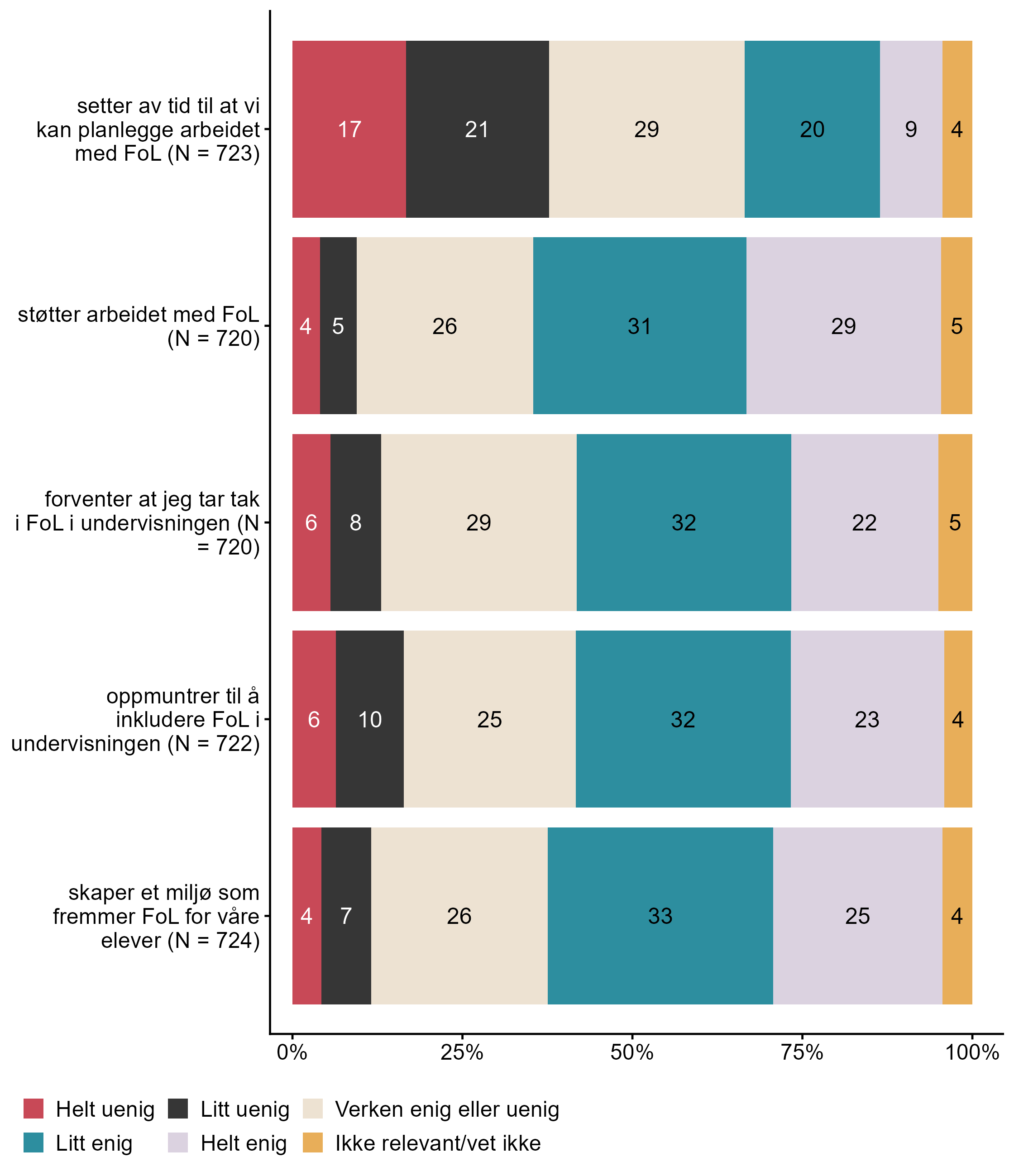 Figur 7.20.I hvilken grad er du enig/uenig i følgende påstander om skoleledelsens arbeid med folkehelse og livsmestring (FoL)? Skoleledelsen. N = [720–724], Figur (PNG), Figurdata (XLSX). (Q_LS37_1,Q_LS37_2,Q_LS37_3,Q_LS37_4,Q_LS37_5)