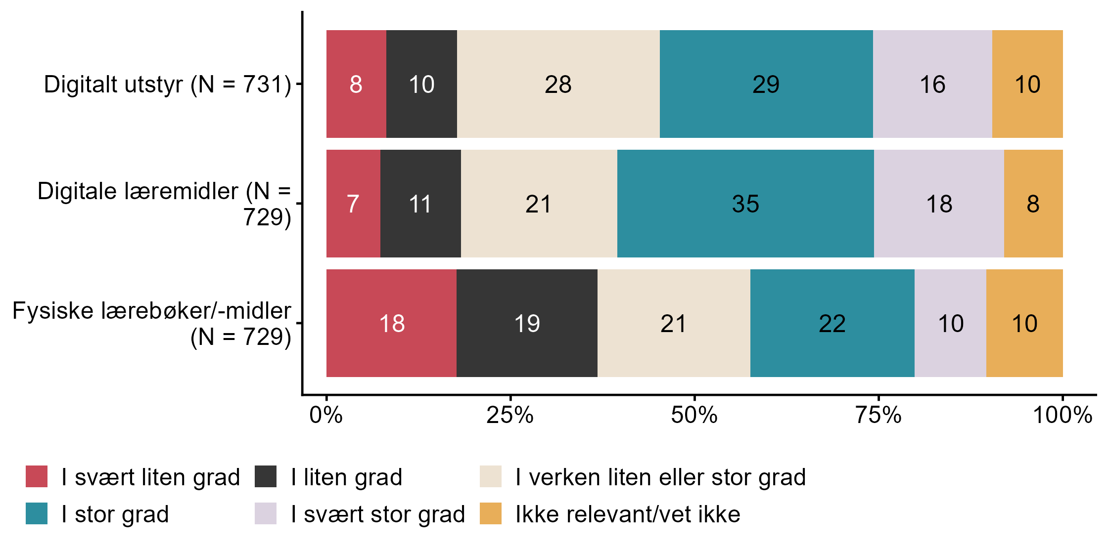 Figur 7.19.I hvilken grad har du tilstrekkelig tilgang på følgende til arbeidet med folkehelse og livsmestring. N = [729–731], Figur (PNG), Figurdata (XLSX). (Q_LS36_1,Q_LS36_2,Q_LS36_3)