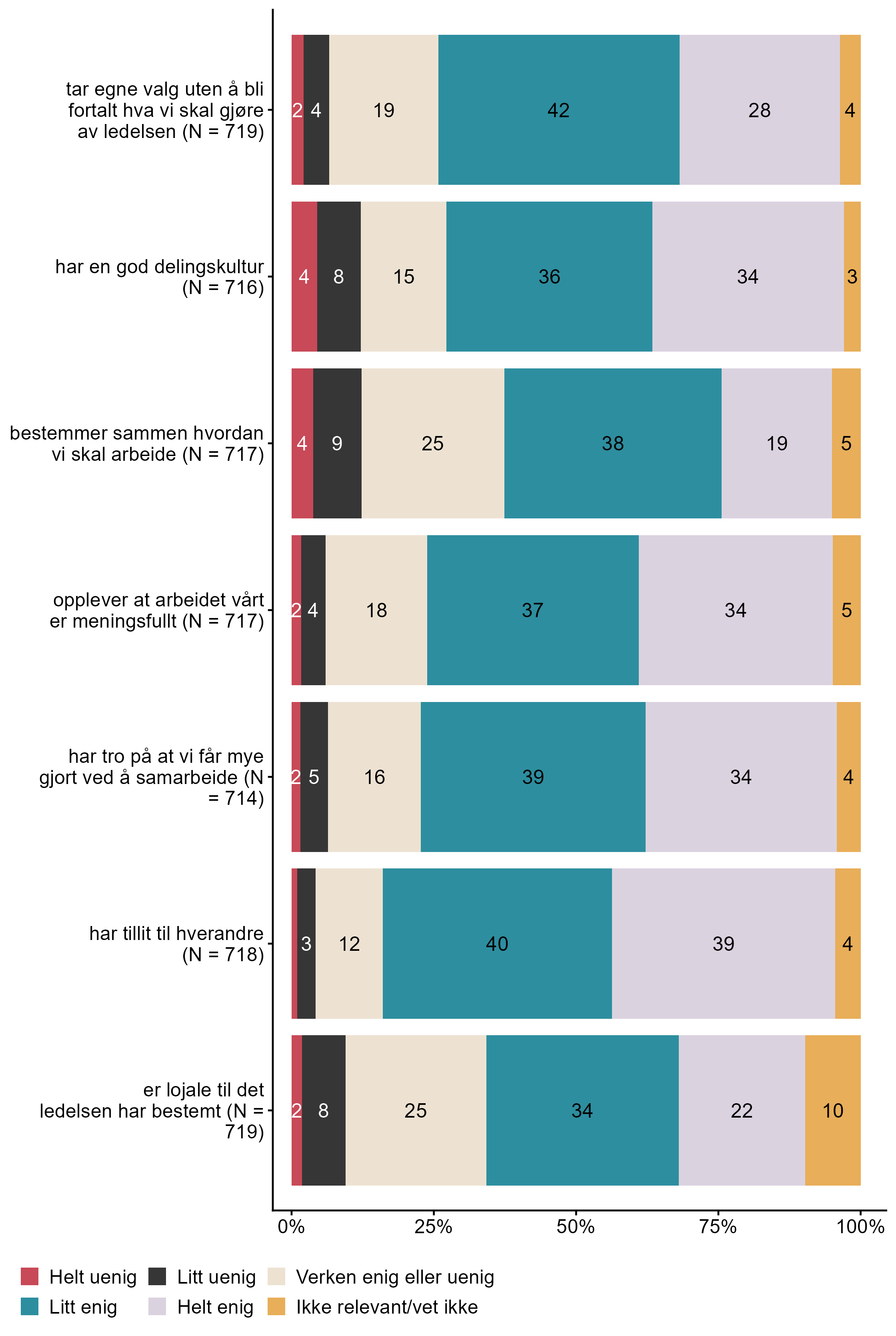 Figur 7.21.I samarbeidet om folkehelse og livsmestring opplever jeg at lærere ved min skole. N = [714–719], Figur (PNG), Figurdata (XLSX). (Q_LS38_1,Q_LS38_2,Q_LS38_3,Q_LS38_4,Q_LS38_5,Q_LS38_6,Q_LS38_7)