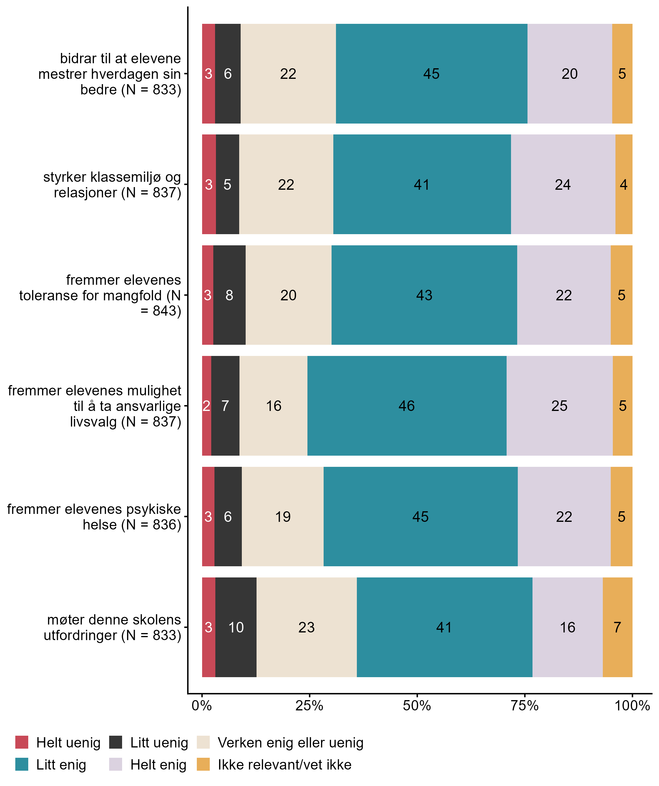 Figur 7.6.Hvor enig er du i at din skoles arbeid med temaet folkehelse og livsmestring. N = [833–843], Figur (PNG), Figurdata (XLSX). (Q_LS18_1,Q_LS18_2,Q_LS18_3,Q_LS18_4,Q_LS18_5,Q_LS18_6)