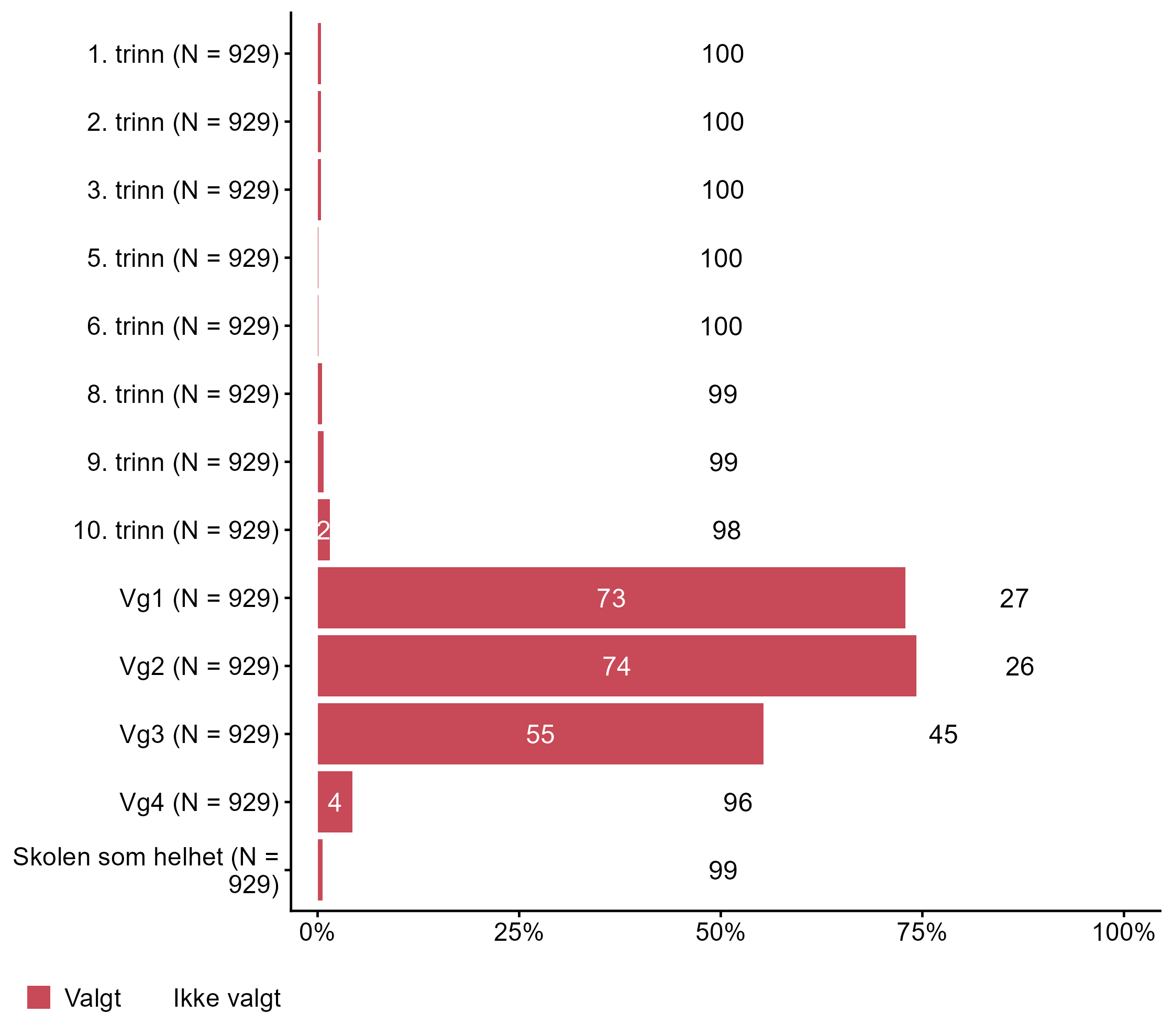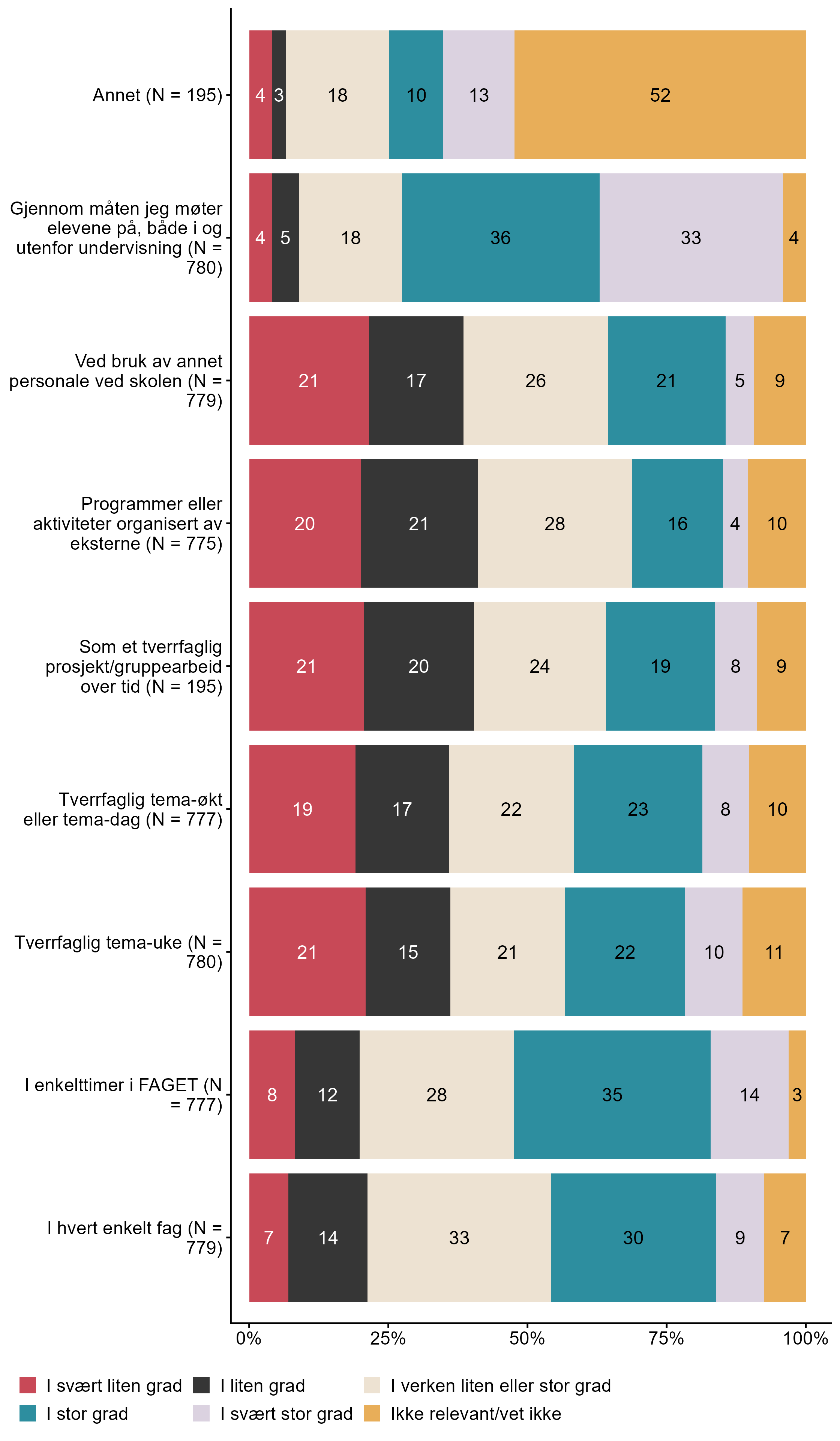 Figur 7.2.I noen av spørsmålene og påstandene vil vi ta utgangspunkt i ett bestemt fag. Velg det faget du sist hadde undervisning i.. N = 936, Figur (PNG), Figurdata (XLSX). (Q_LS12_DERIVED)