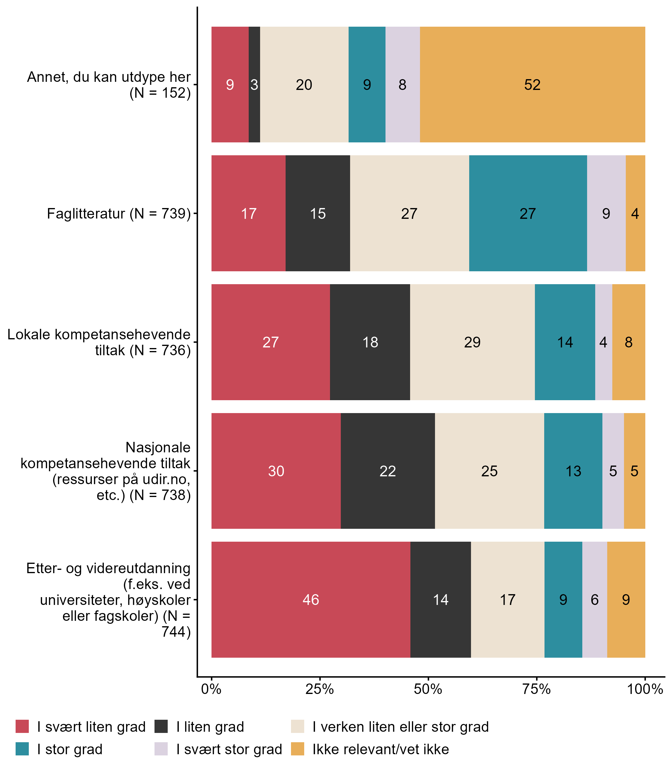 Figur 7.15.I hvilken grad benytter du følgende kompetansehevende tiltak relatert til folkehelse og livsmestring?. N = [152–744], Figur (PNG), Figurdata (XLSX). (Q_LS30_1,Q_LS30_2,Q_LS30_3,Q_LS30_4,Q_LS30_5)