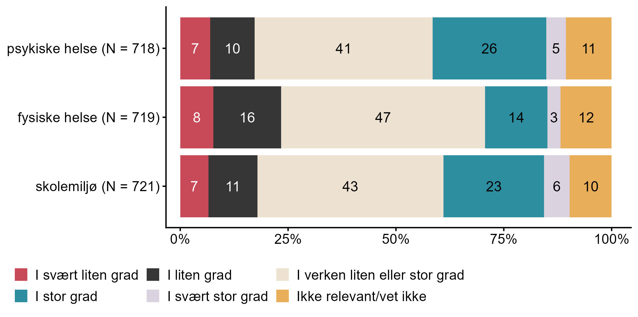 Figur 7.22.Alt i alt, i hvilken grad opplever du at innføringen av folkehelse og livsmestring i LK20 har forbedret skolens arbeid med elevenes. N = [718–721], Figur (PNG), Figurdata (XLSX). (Q_LS39_1,Q_LS39_2,Q_LS39_3)
