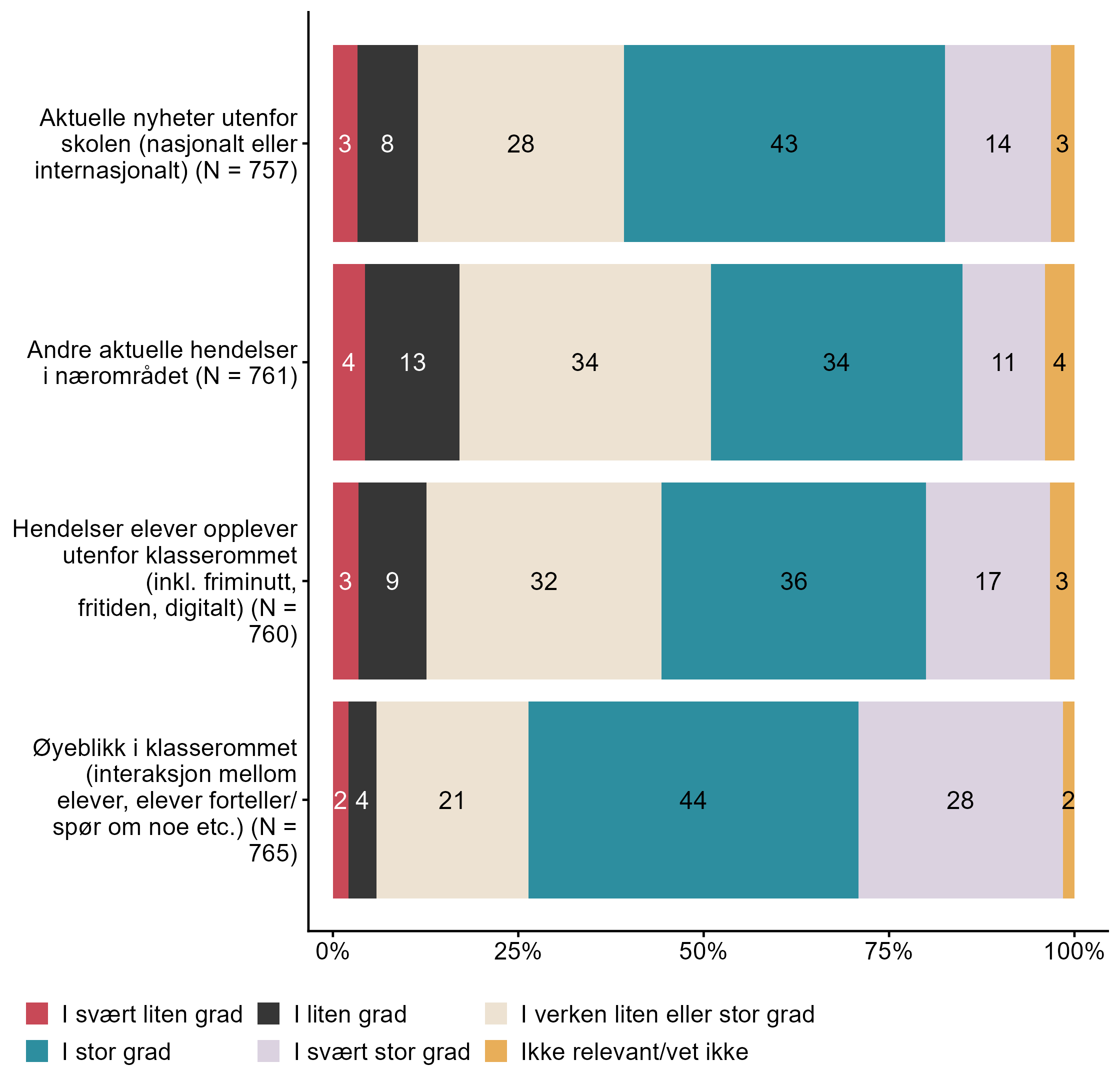 Figur 7.11.Arbeid med FoL kan foregå planlagt, men kan også skje spontant, gjerne kalt læringsøyeblikk. I hvilken grad legger du til rette for å lære elevene om folkehelse og livsmestring i følgende læringsøyeblikk?. N = [757–765], Figur (PNG), Figurdata (XLSX). (Q_LS25_1,Q_LS25_2,Q_LS25_3,Q_LS25_4)
