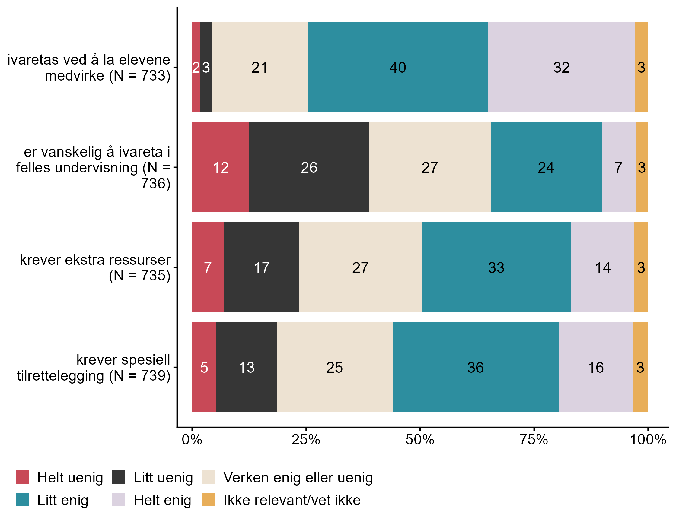 Figur 7.16.Hvor uenig/enig er du i følgende påstander. Å sikre at alle elever opplever tilhørighet når det arbeides med folkehelse og livsmestring. N = [733–739], Figur (PNG), Figurdata (XLSX). (Q_LS32_1,Q_LS32_2,Q_LS32_3,Q_LS32_4)