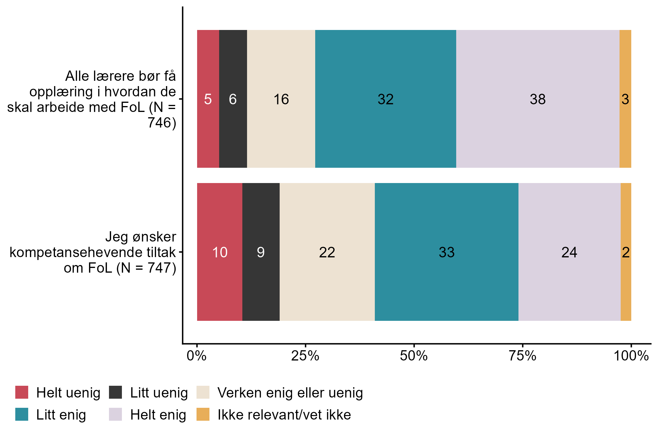 Figur 7.14.Hvor enig er du i følgende utsagn om kompetansehevende tiltak innen folkehelse og livsmestring (FoL)?. N = [746–747], Figur (PNG), Figurdata (XLSX). (Q_LS29_1,Q_LS29_2)