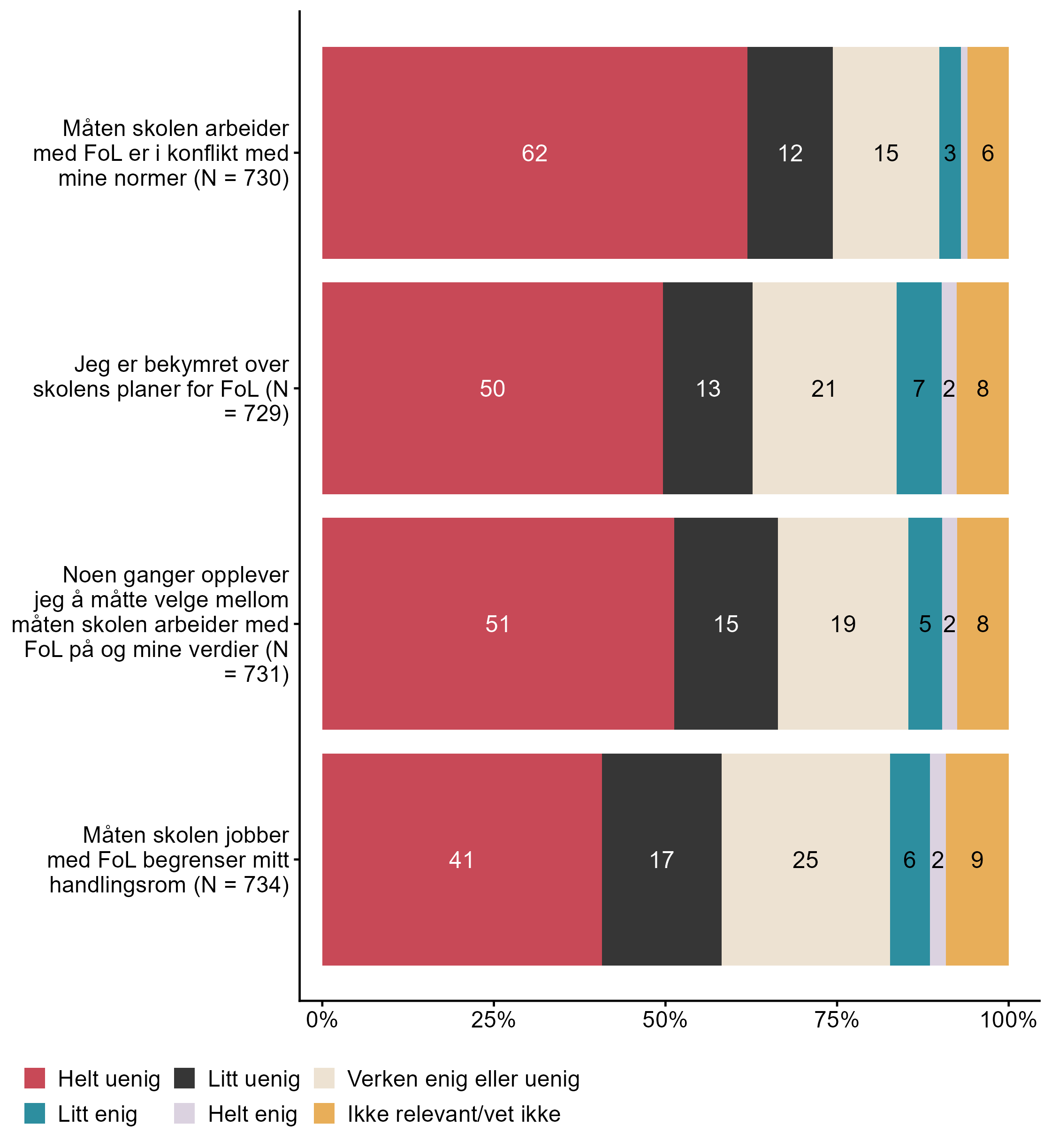 Figur 7.18.Ta stilling til de følgende påstandene om din skoles arbeid med folkehelse og livsmestring (FoL). N = [729–734], Figur (PNG), Figurdata (XLSX). (Q_LS35_1,Q_LS35_2,Q_LS35_3,Q_LS35_4)
