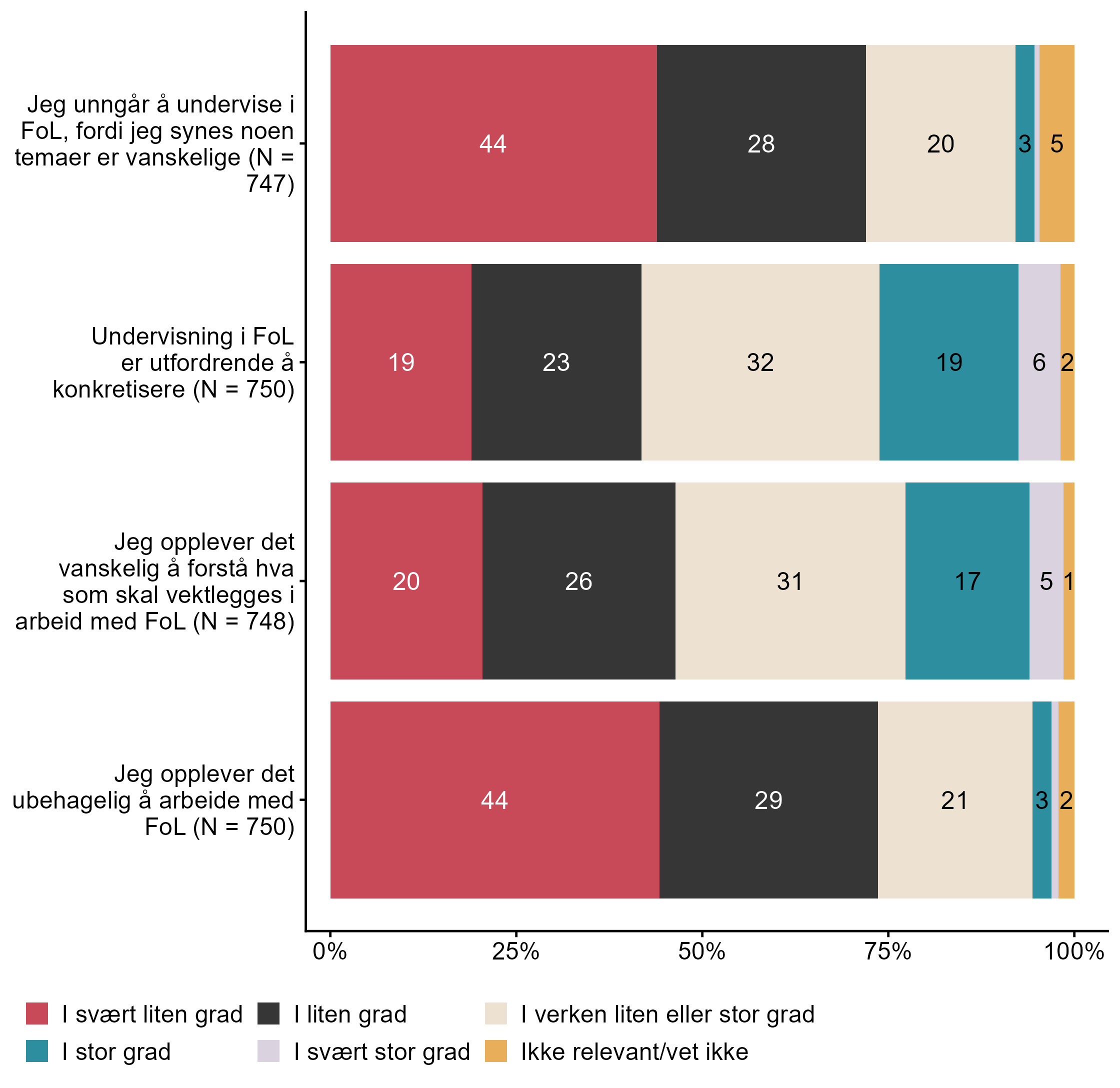 Figur 7.13.I hvilken grad opplever du utfordringer tilknyttet arbeidet med folkehelse og livsmestring (FoL)?. N = [747–750], Figur (PNG), Figurdata (XLSX). (Q_LS28_1,Q_LS28_2,Q_LS28_3,Q_LS28_4)
