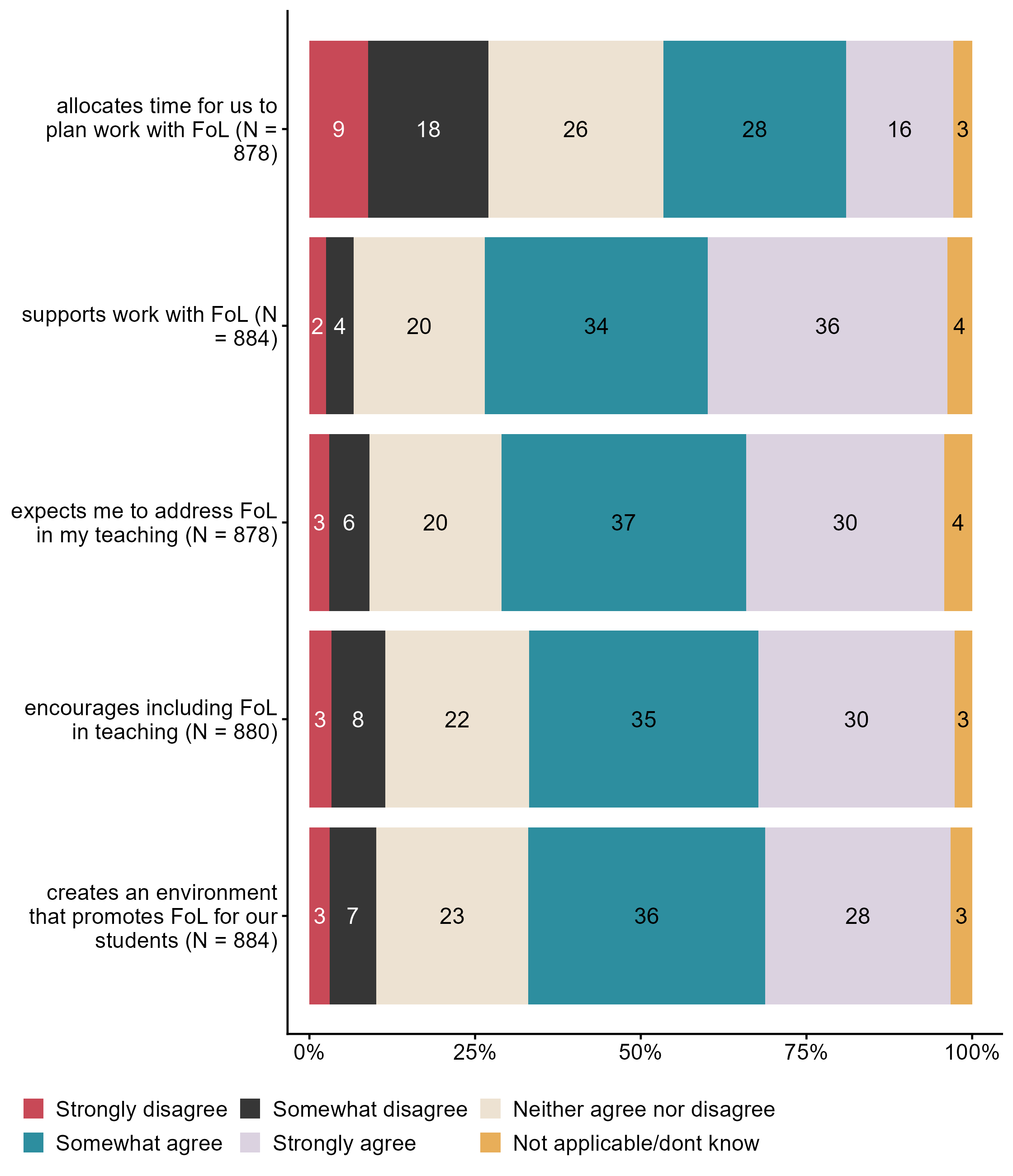 Figur 3.20.To what extent do you agree/disagree with the following statements about the school leadership’s work with public health and life skills (FoL)? The school leadership. N = [878–884], Figur (PNG), Figurdata (XLSX). (Q_LS37_1,Q_LS37_2,Q_LS37_3,Q_LS37_4,Q_LS37_5)