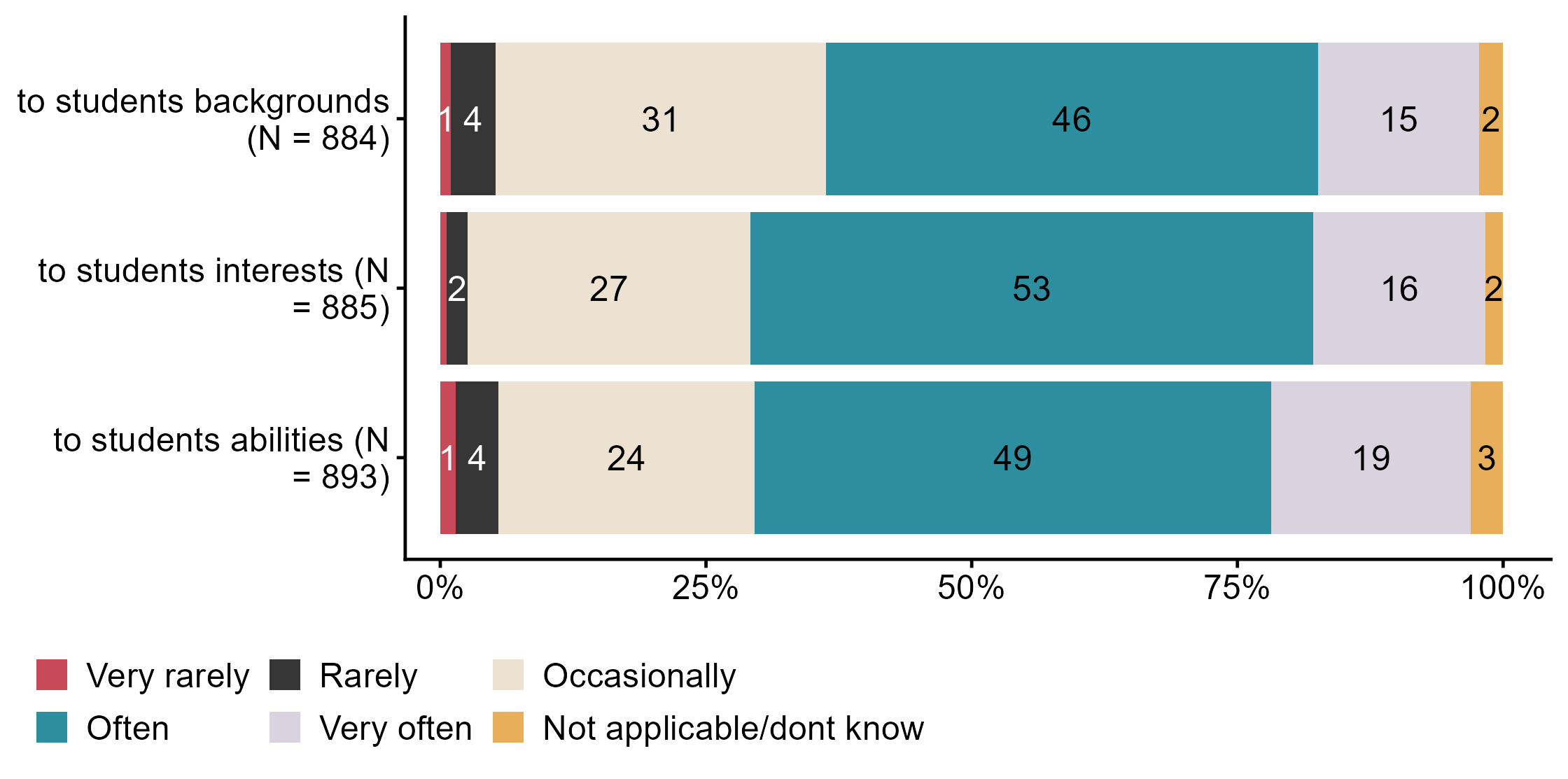 Figur 3.17.How often do you adapt work with public health and life skills. N = [884–893], Figur (PNG), Figurdata (XLSX). (Q_LS33_1,Q_LS33_2,Q_LS33_3)