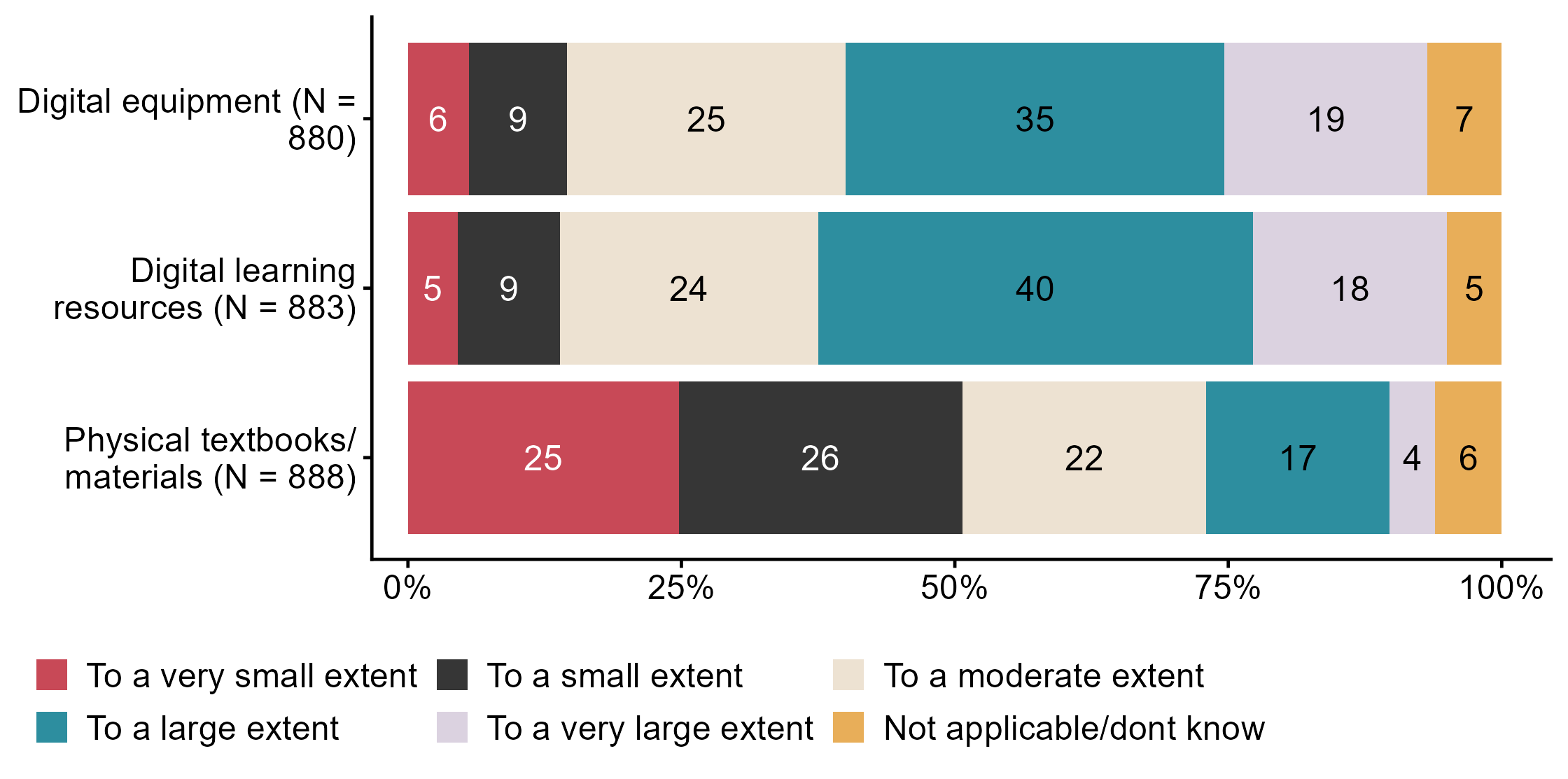 Figur 3.19.To what extent do you have sufficient access to the following for work with public health and life skills. N = [880–888], Figur (PNG), Figurdata (XLSX). (Q_LS36_1,Q_LS36_2,Q_LS36_3)