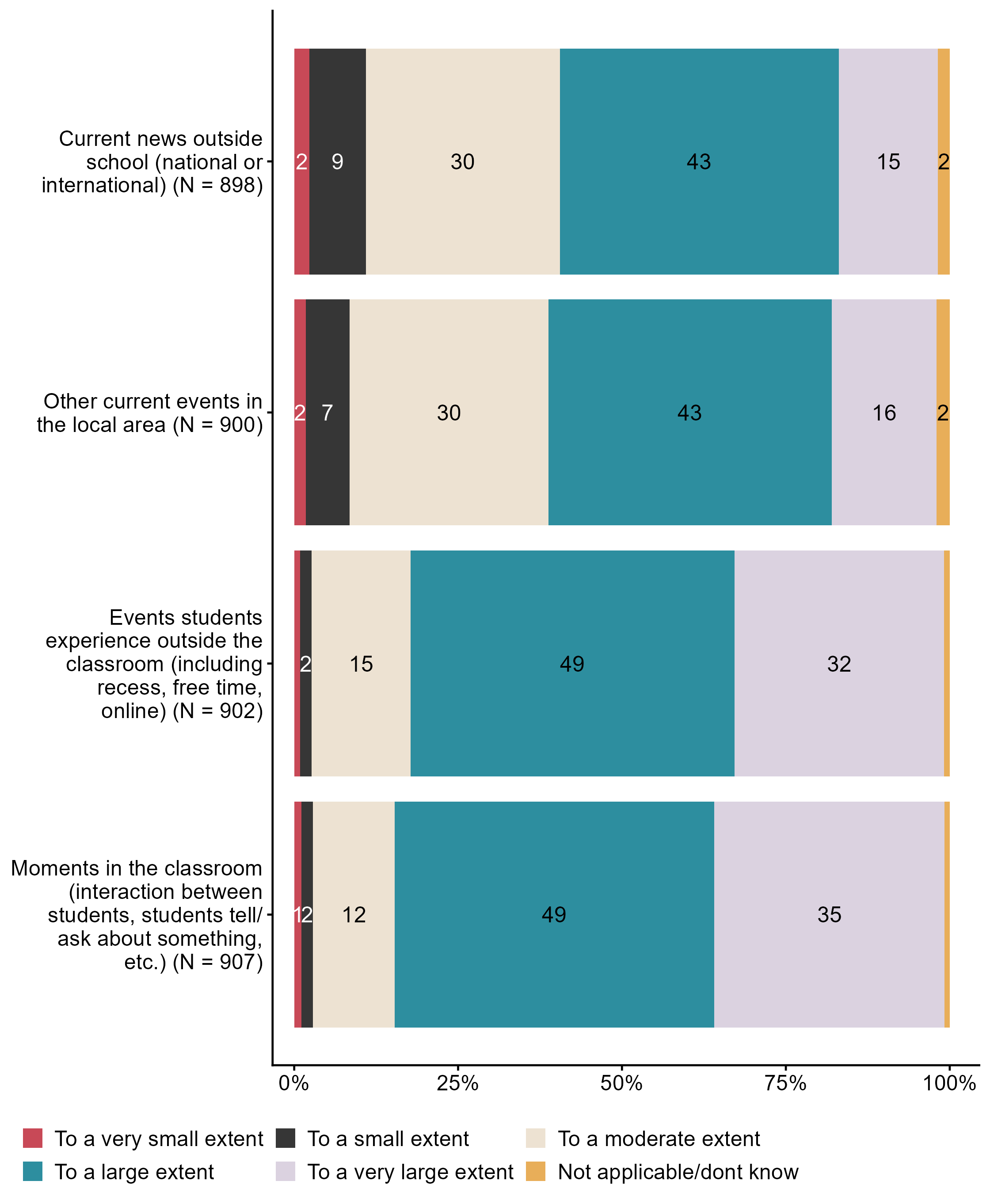 Figur 3.11.Work with FoL can be planned, but can also occur spontaneously, often called ‘learning moments’. To what extent do you facilitate learning about public health and life skills in the following learning moments?. N = [898–907], Figur (PNG), Figurdata (XLSX). (Q_LS25_1,Q_LS25_2,Q_LS25_3,Q_LS25_4)