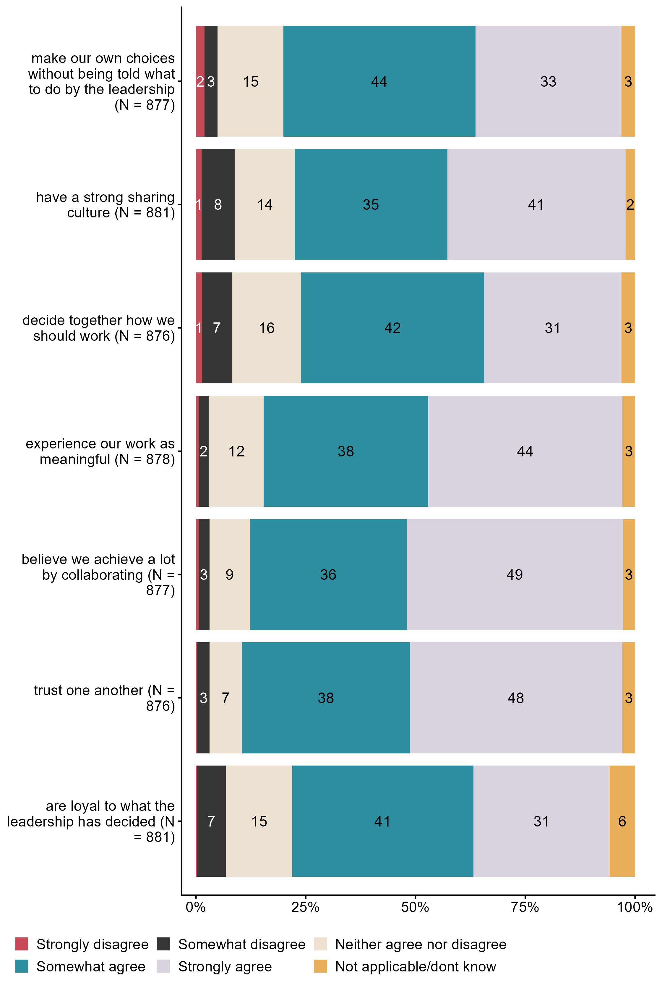 Figur 3.21.In collaboration on public health and life skills I find that teachers at my school. N = [876–881], Figur (PNG), Figurdata (XLSX). (Q_LS38_1,Q_LS38_2,Q_LS38_3,Q_LS38_4,Q_LS38_5,Q_LS38_6,Q_LS38_7)