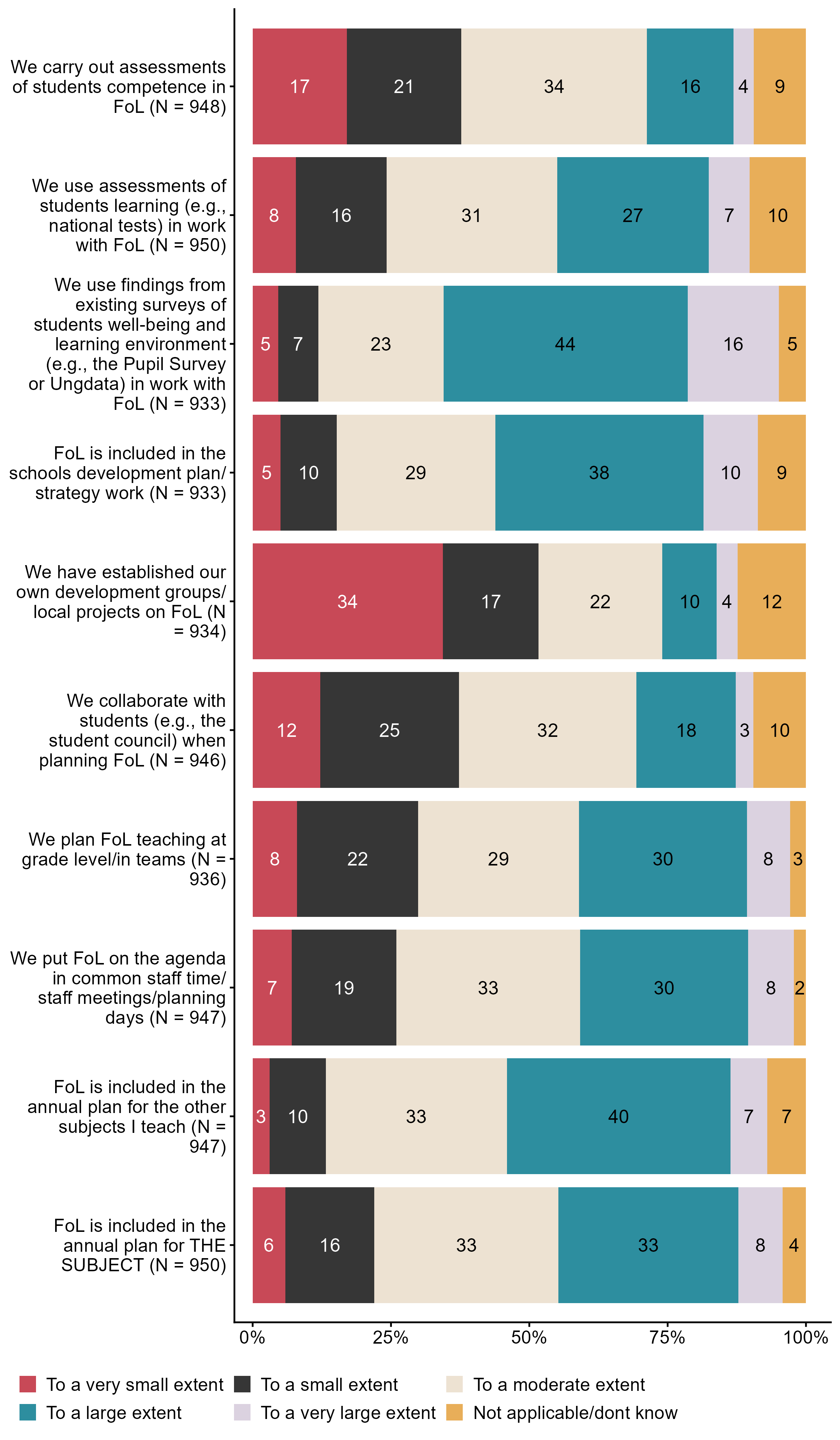 Figur 3.8.How do you work with public health and life skills (FoL) at your school?. N = [933–950], Figur (PNG), Figurdata (XLSX). (Q_LS21_1,Q_LS21_2,Q_LS21_3,Q_LS21_4,Q_LS21_5,Q_LS21_6,Q_LS22_1,Q_LS22_2,Q_LS22_3,Q_LS22_4)