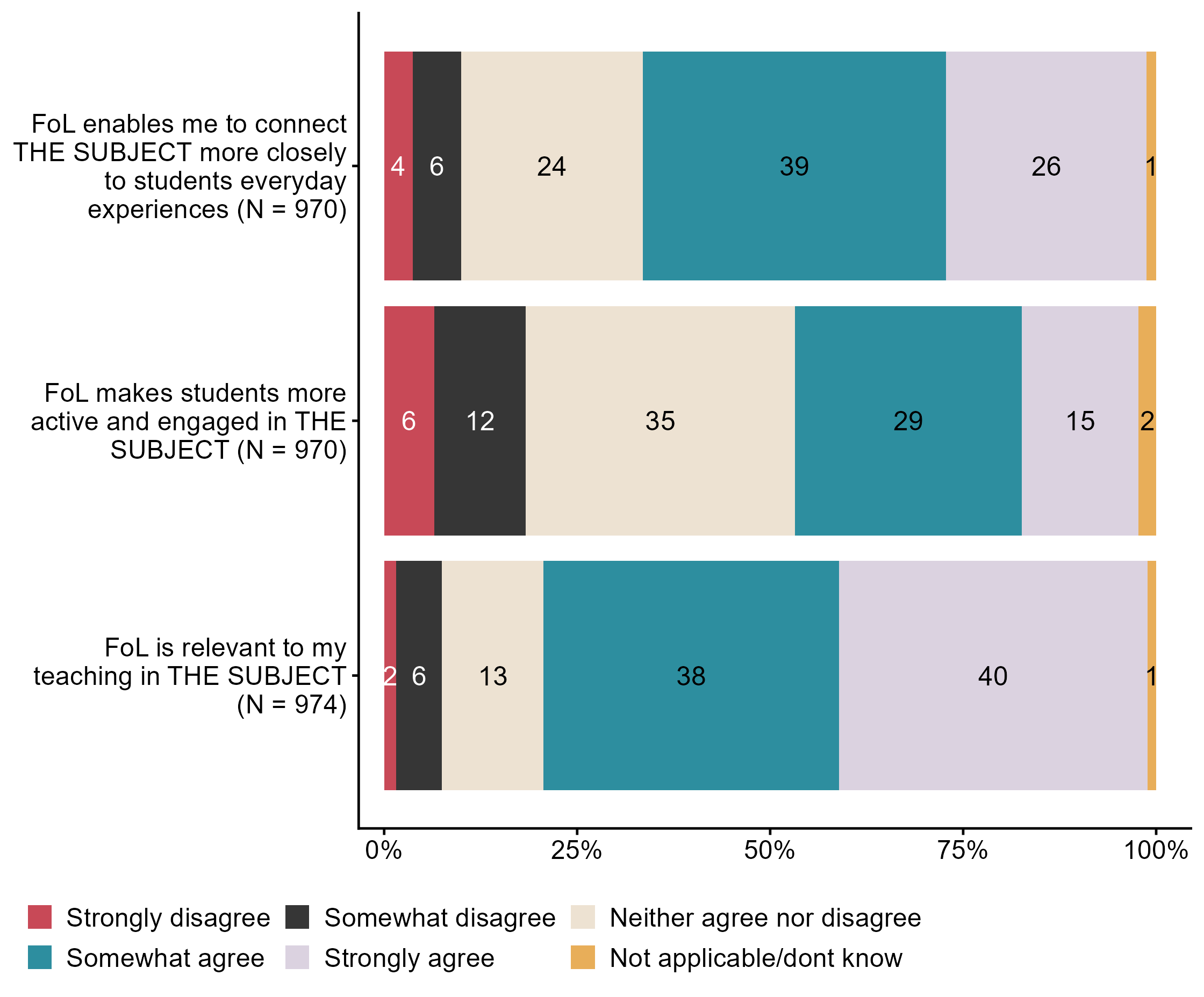 Figur 3.7.How much do you disagree/agree with the following statements about work with public health and life skills (FoL) in THE SUBJECT?. N = [970–974], Figur (PNG), Figurdata (XLSX). (Q_LS19_1,Q_LS19_2,Q_LS19_3)
